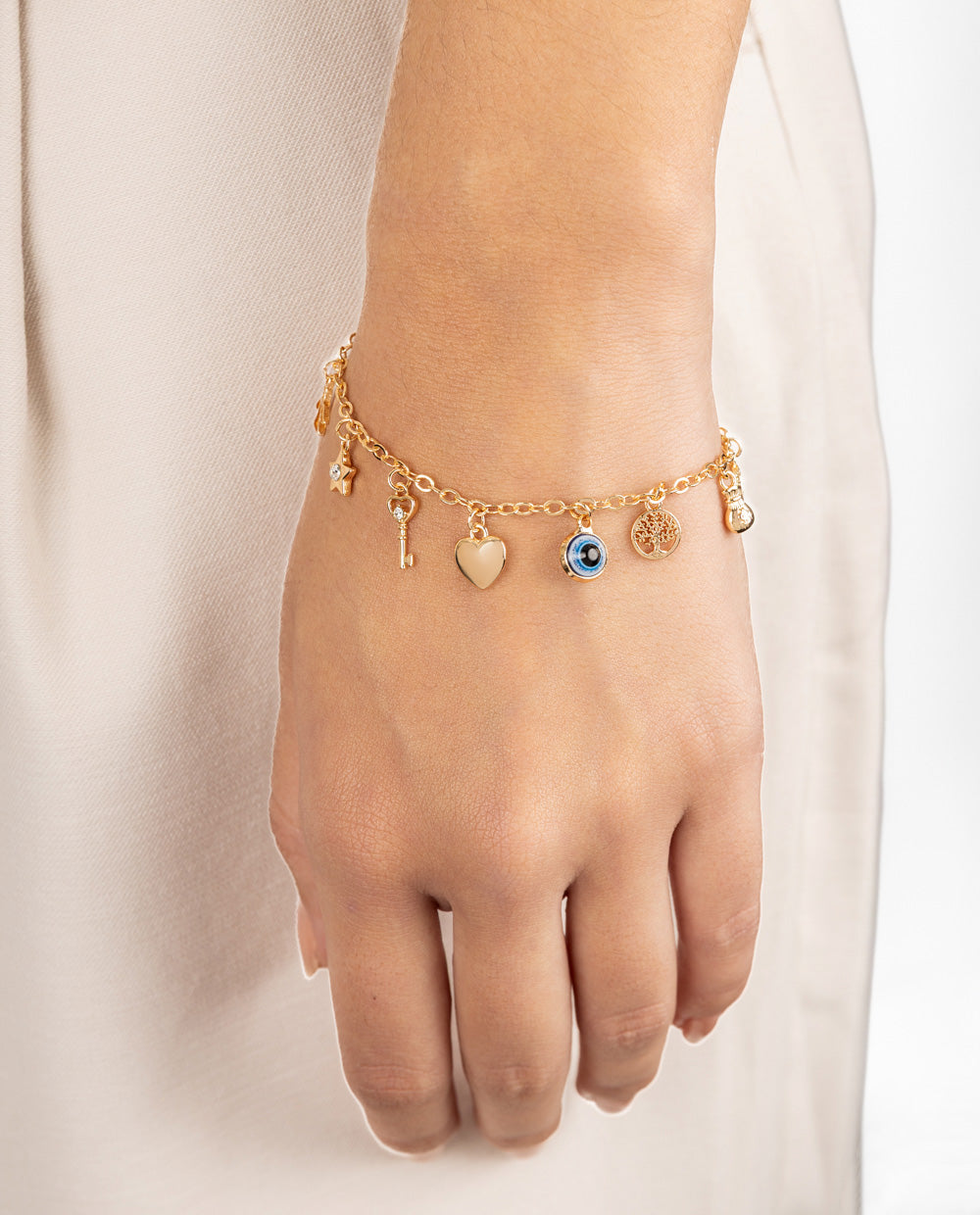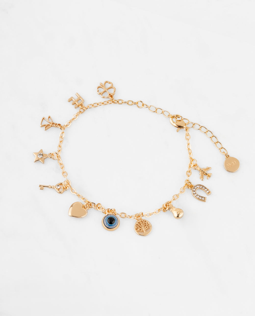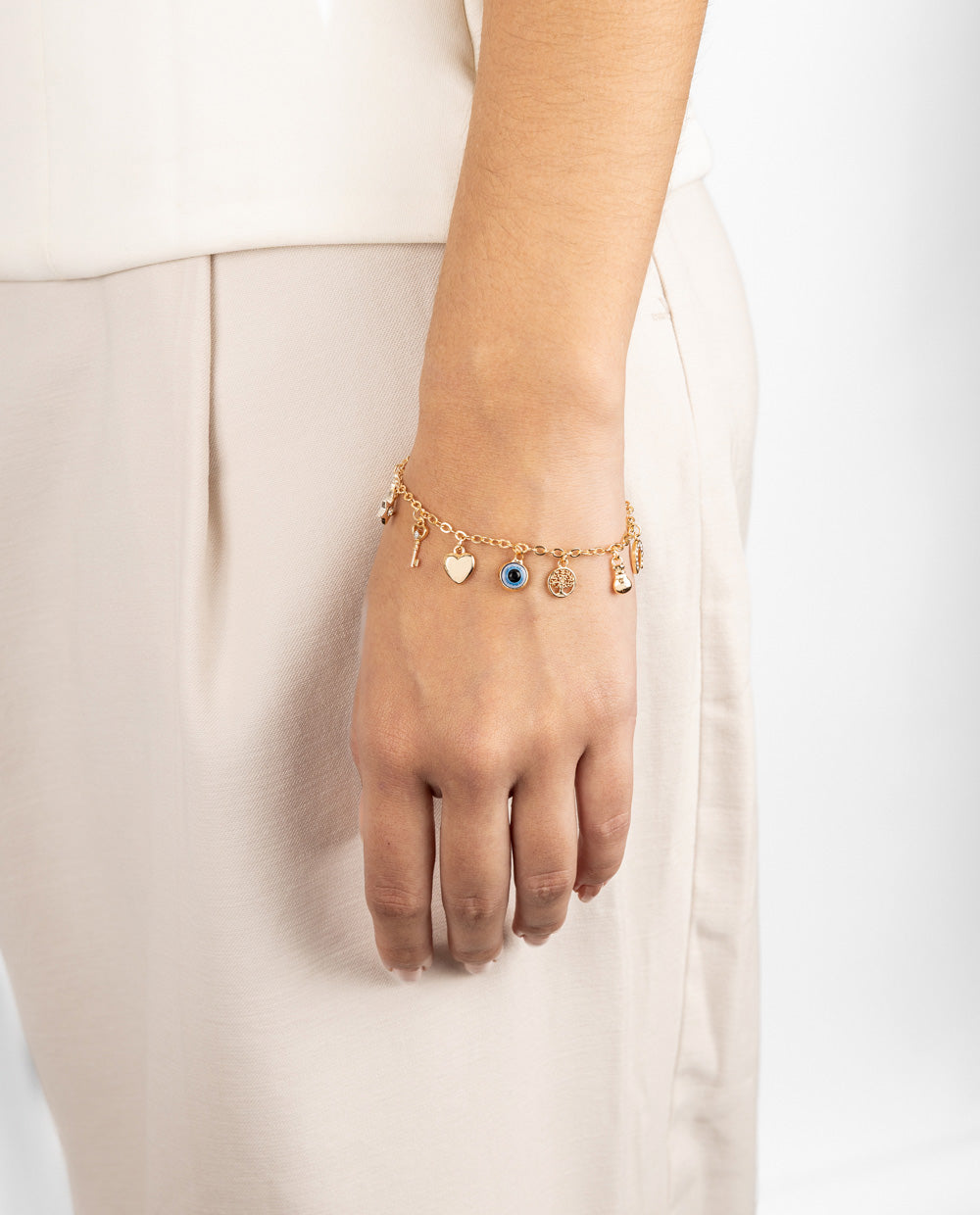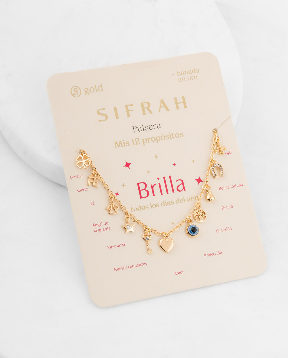 Pulsera dorada bañada en oro con 12 charms simbólicos que representan deseos y buenos propósitos para brillar todo el año. Ajustable e hipoalergénica de la colección premium, ideal para pieles sensibles.