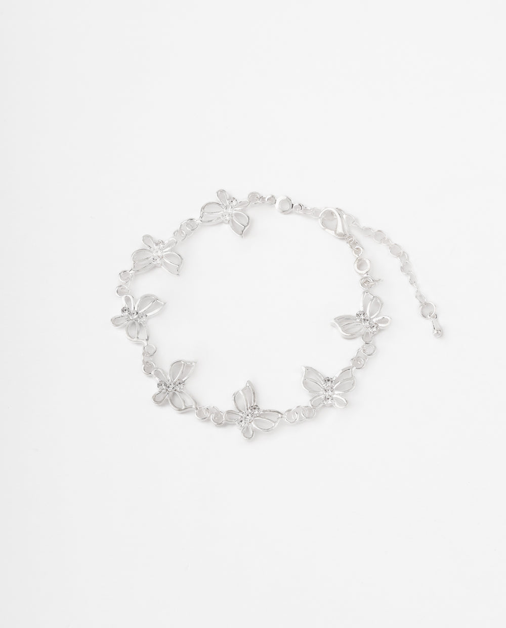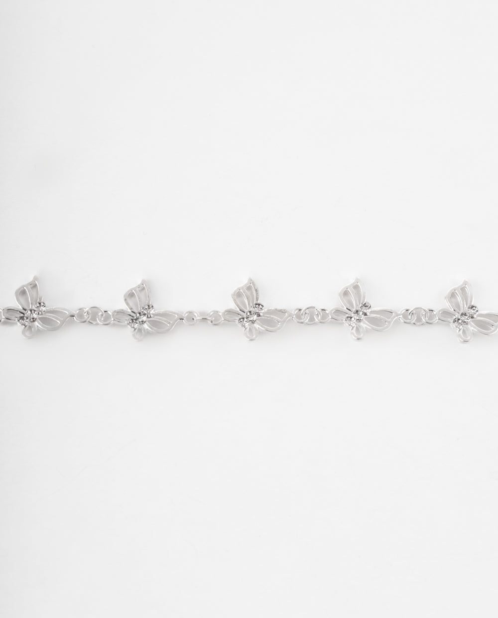 Pulsera plateada con delicados apliques de mariposas que se entrelazan en un diseño femenino y elegante. Ideal para darle un toque sutil de brillo a tus outfits diarios o para acompañar momentos especiales con un accesorio que refleja ligereza y estilo.
