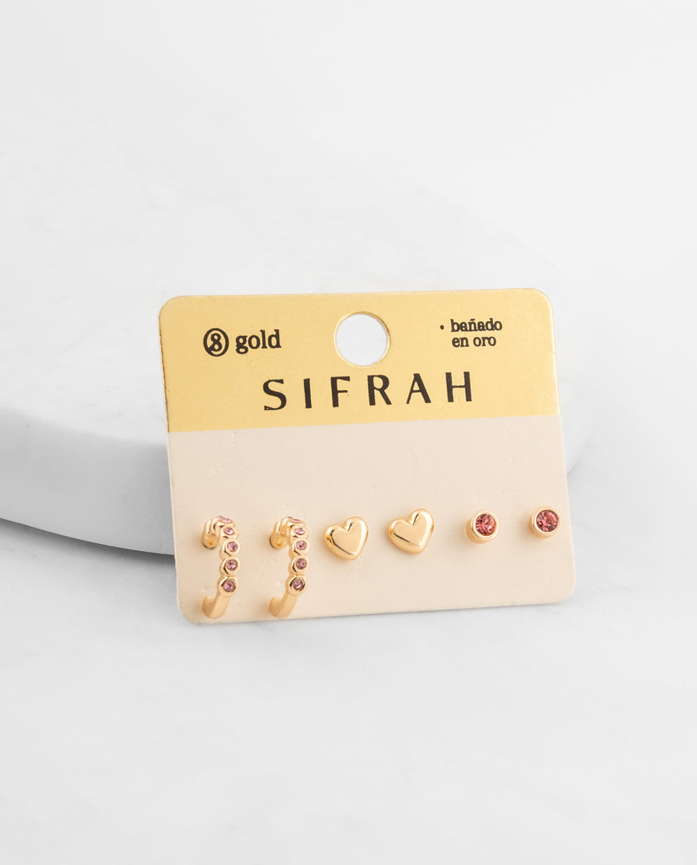 Set de 3 pares de aretes bañados en oro con pedrería rosada. Incluye mini argollas con incrustaciones, corazones lisos y studs clásicos. Hipoalergénicos perfectos para pieles sensibles.