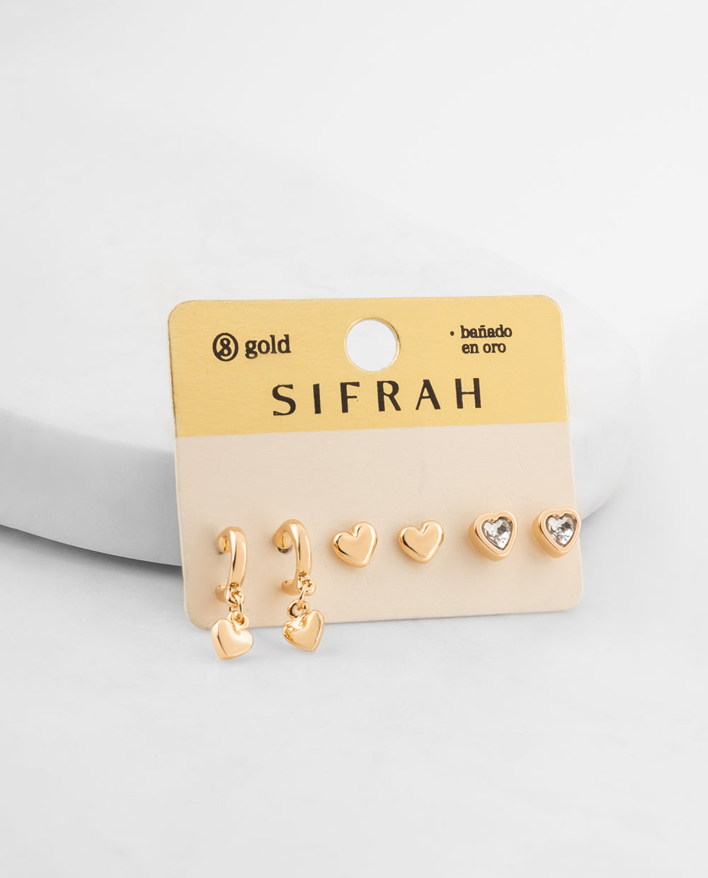Set de 3 pares de aretes bañados en oro con diseños de corazón: colgantes, studs lisos y studs con pedrería. Hipoalergénicos perfectos para pieles sensibles.