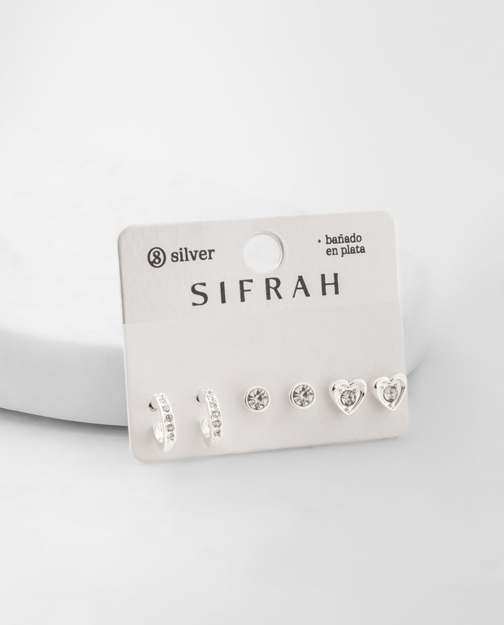 Set de 3 pares de aretes bañados en plata con diseños delicados: mini argollas con incrustaciones, studs con pedrería y corazones con detalle. Hipoalergénicos perfectos para pieles sensibles.