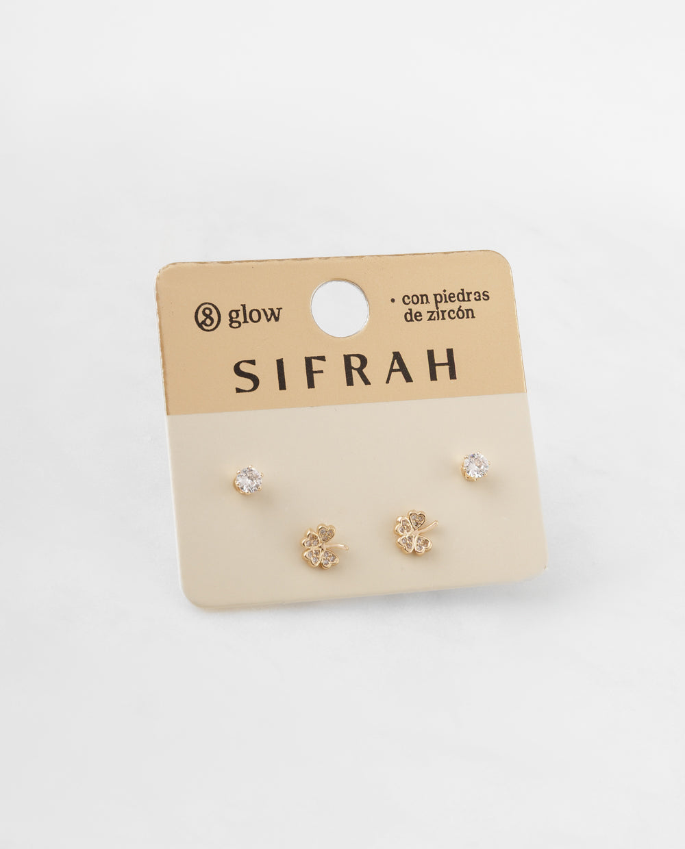 Este set incluye dos pares de aretes dorados: un diseño clásico con piedras de zircón y otro en forma de flor con detalles brillantes. Bañados en oro, aportan elegancia y versatilidad para usar en el día a día o en ocasiones especiales. Una propuesta de la colección Glow que refleja frescura y sofisticación con un toque delicado.