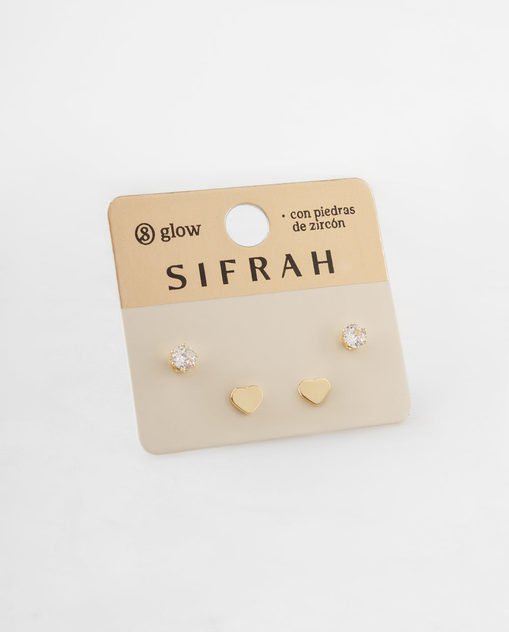 Este set incluye dos pares de aretes: un diseño minimalista en forma de corazón y otro con piedras de zircón que aportan brillo delicado. Bañados en oro, son el complemento perfecto para looks primaverales, adaptándose tanto a outfits casuales como elegantes. Una propuesta versátil de la colección Glow que combina frescura, feminidad y un toque boho chic.