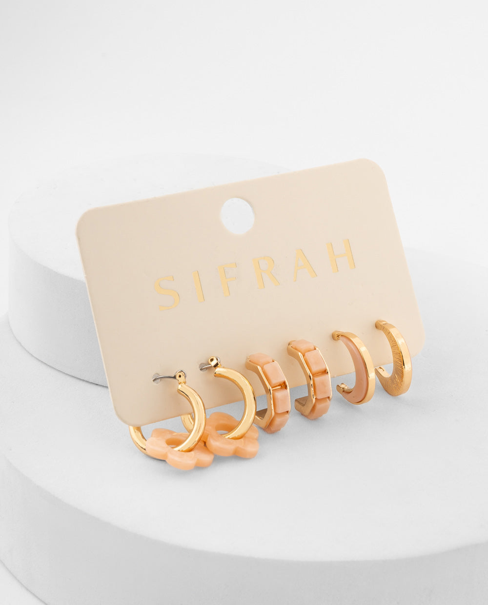 Mix de argollas y aretes dorados en tonos durazno, con acabados lisos y segmentados.