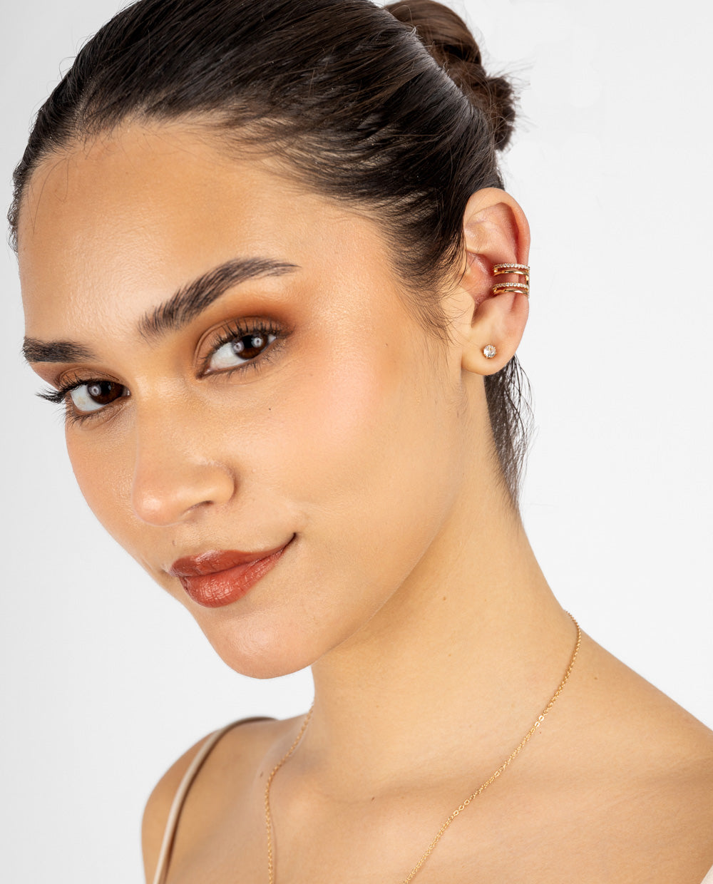 Set de aretes dorados bañados en oro que combinan un ear cuff con brillo y un stud de zircón, perfectos para un look moderno y elegante.