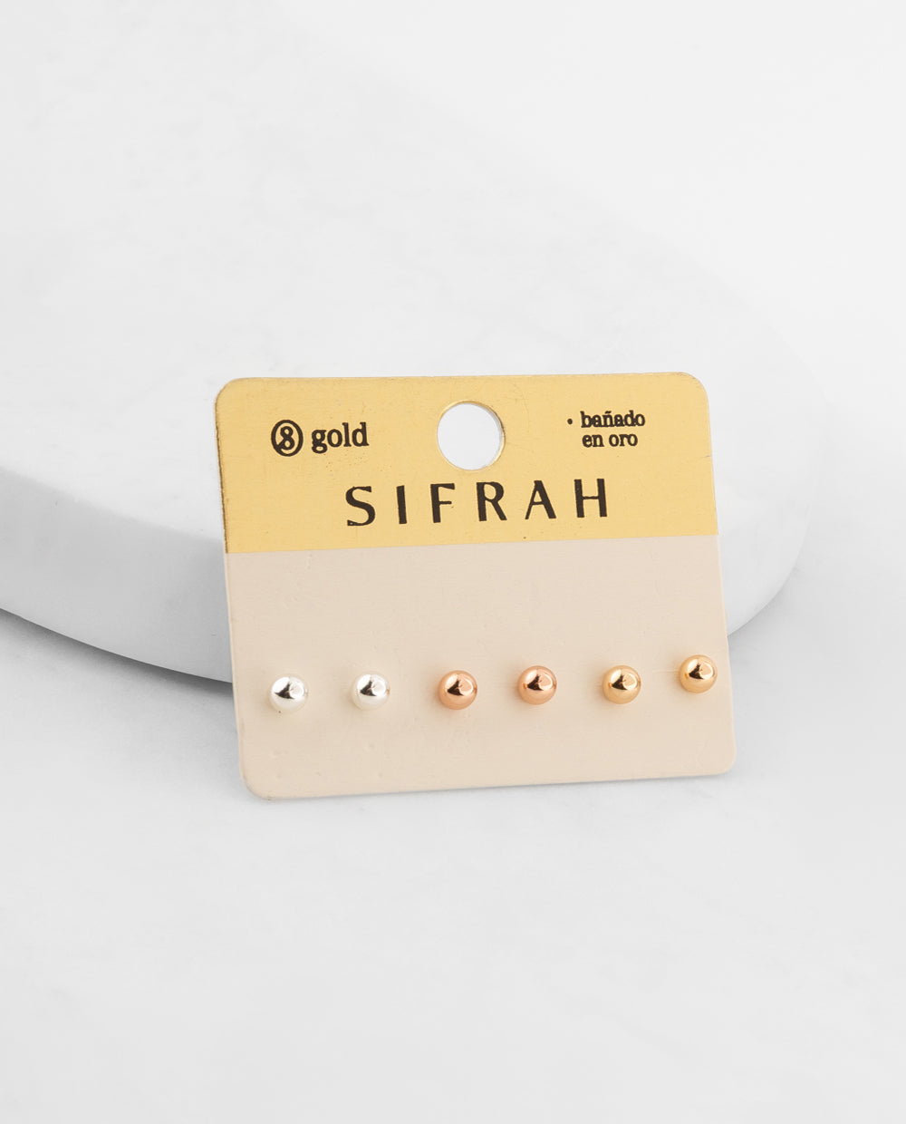 Aretes pequeños tipo stud bañados en oro, hipoalergénicos y de acabado brillante. Incluye 3 pares en tonos dorado, rosado y plateado.