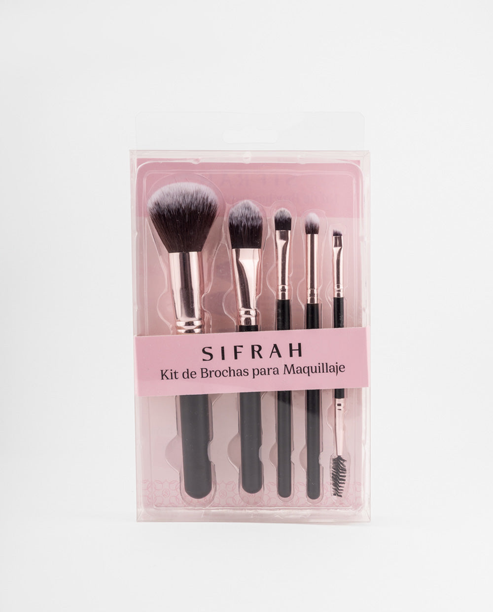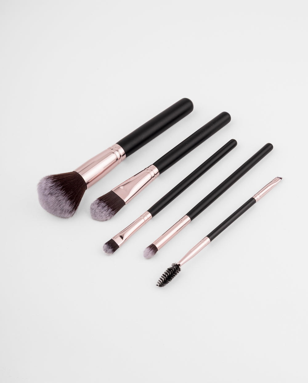 Set de 5 brochas con mango negro y detalles rose gold, cerdas suaves para aplicar polvo, base, sombras y definir cejas con acabado preciso.