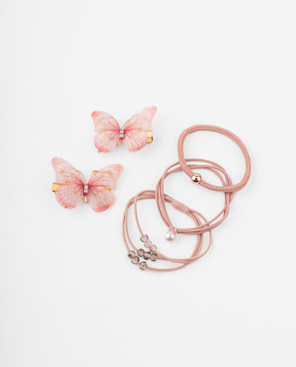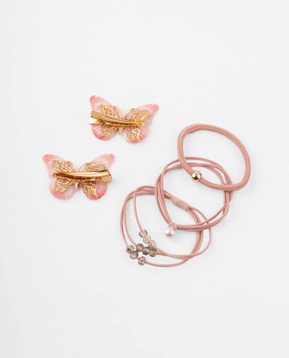 Un set delicado y femenino que combina la practicidad de las ligas con el encanto de los ganchos en forma de mariposa. Sus tonos rosa suave, con detalles brillantes, le darán un aire romántico y dulce a tu peinado. Ideal para usar en el día a día o para elevar un look especial con un toque sutil de brillo.