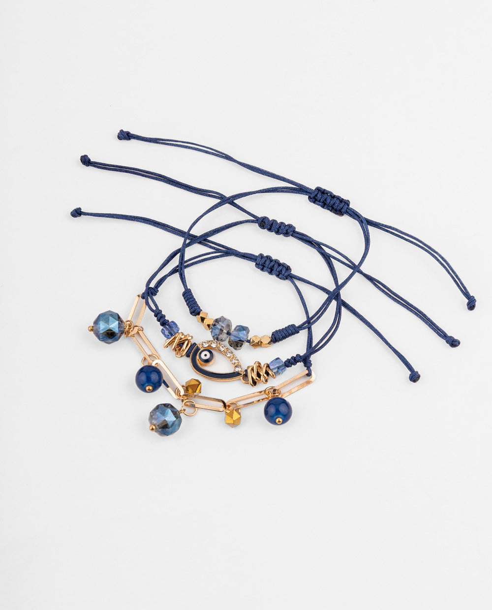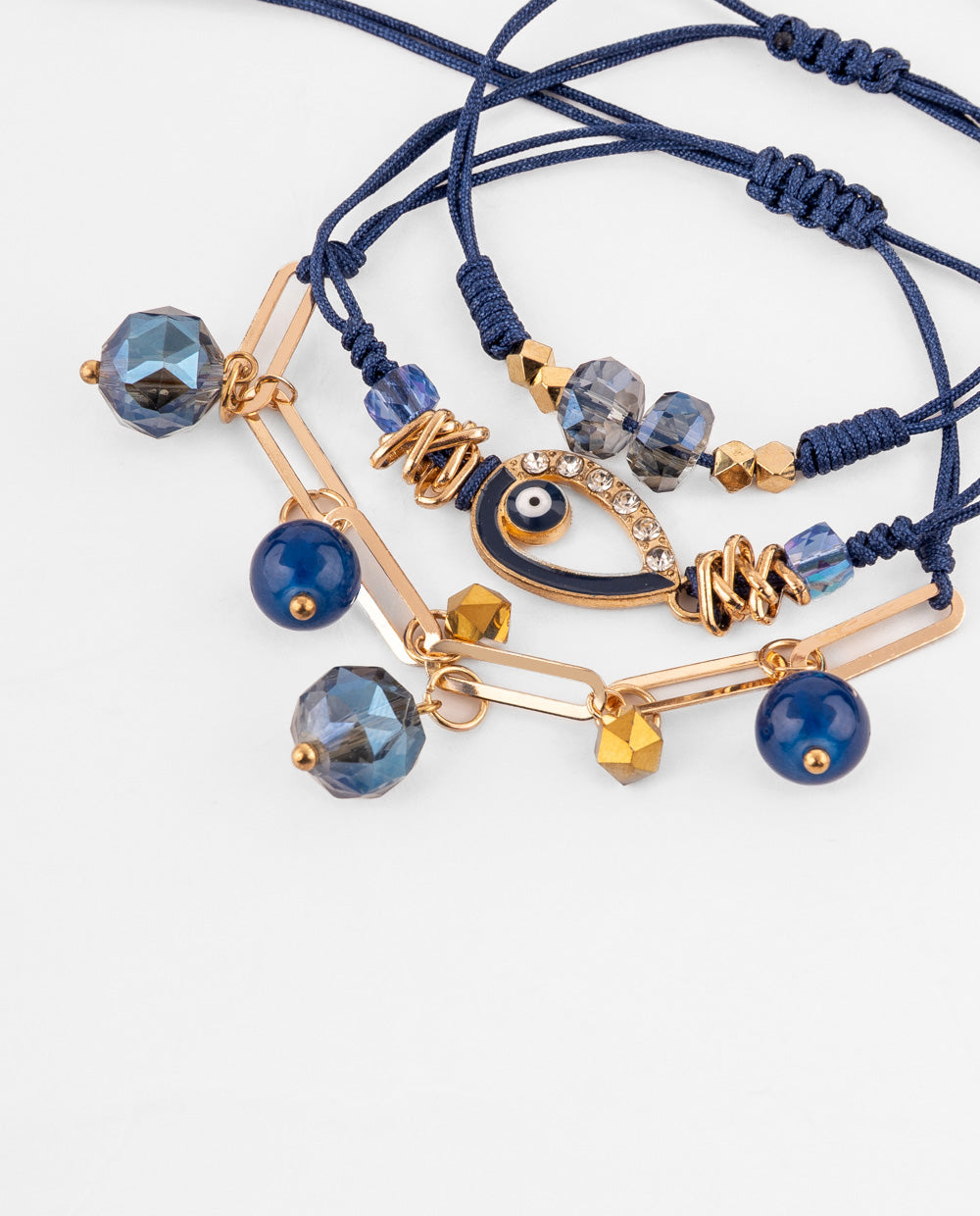 Set de pulseras en cordón azul marino con cuentas facetadas, detalles dorados metalizados y dije de ojo protector con incrustaciones brillantes. Diseñadas para atraer buena energía y sumar un toque místico y moderno a tu estilo.