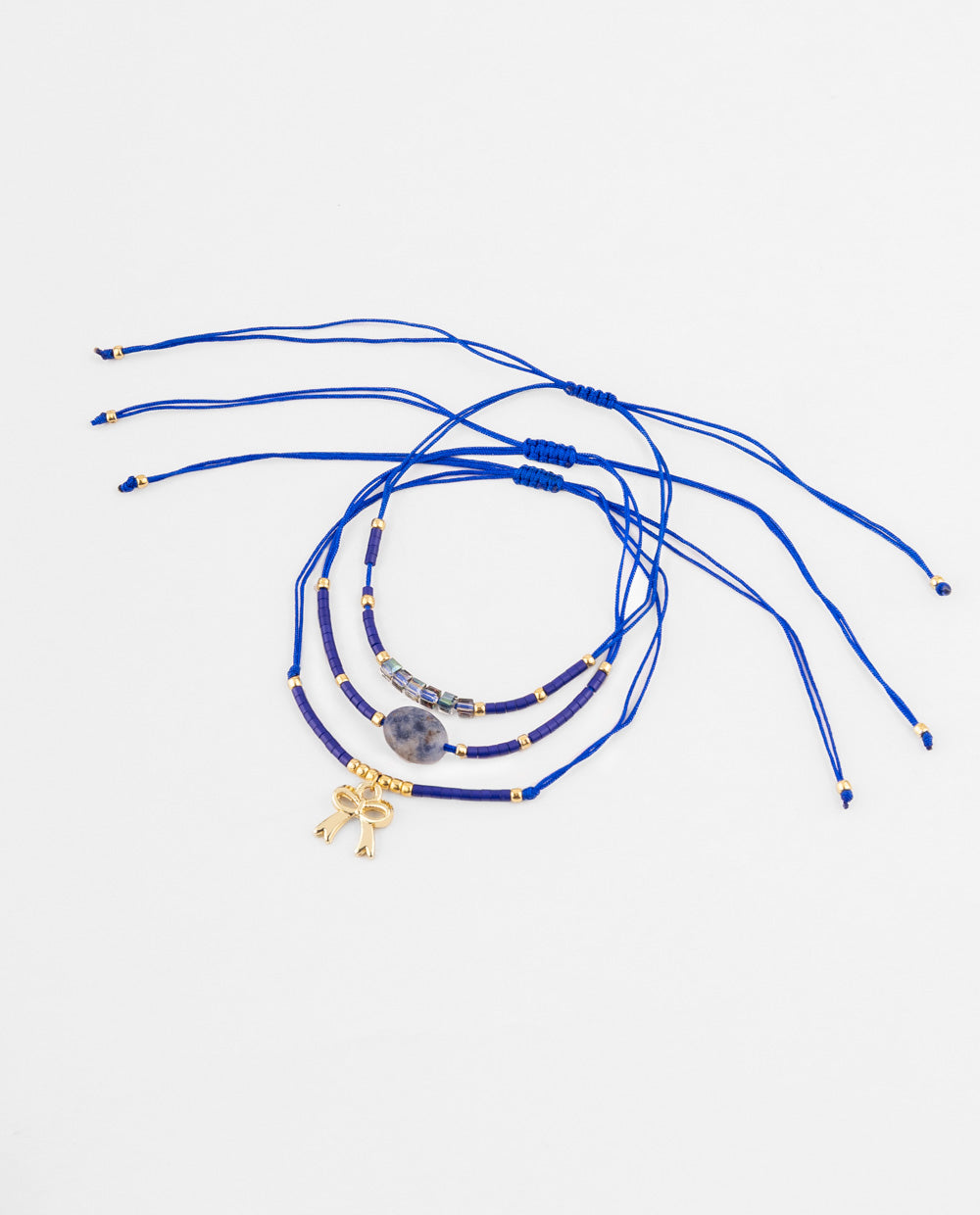 Set de pulseras ajustables en cordón azul intenso con detalles dorados y dije de lazo. Incluye cuentas facetadas y un toque de piedra natural que le da carácter único. Llévalas juntas para un look moderno y lleno de energía o por separado para un detalle sutil en tu día a día.