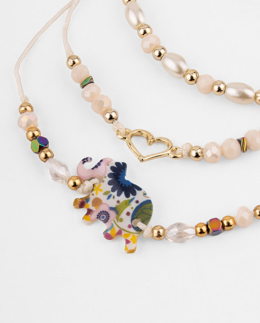Set de pulseras en cordón beige con cuentas doradas y detalle de dije multicolor en forma de elefante. Ligeras y ajustables, son perfectas para darle un aire fresco y divertido a tu estilo. Puedes usarlas juntas para un look alegre o separarlas para un detalle delicado en tu día a día.