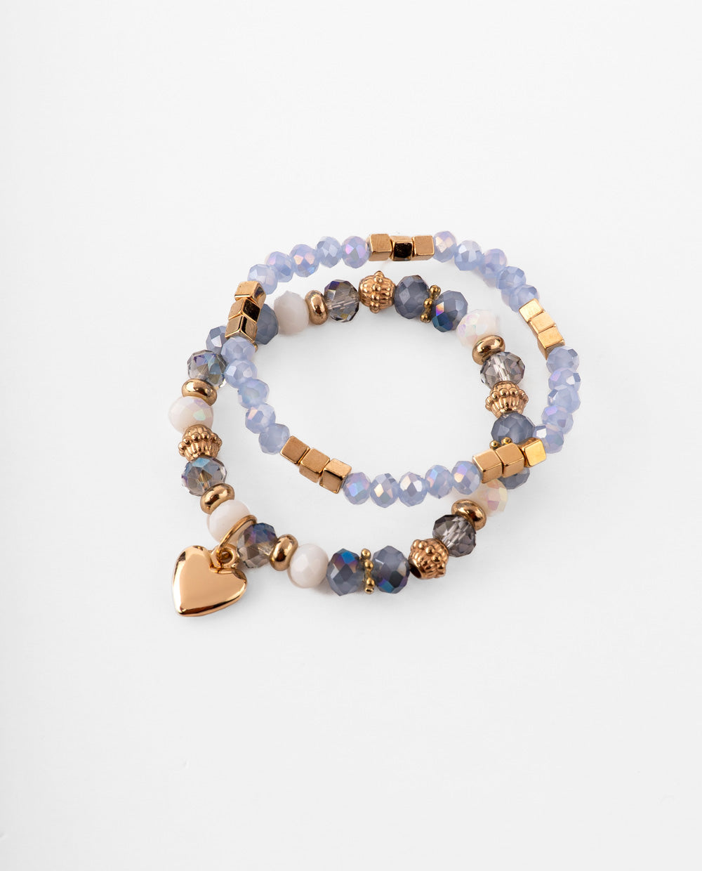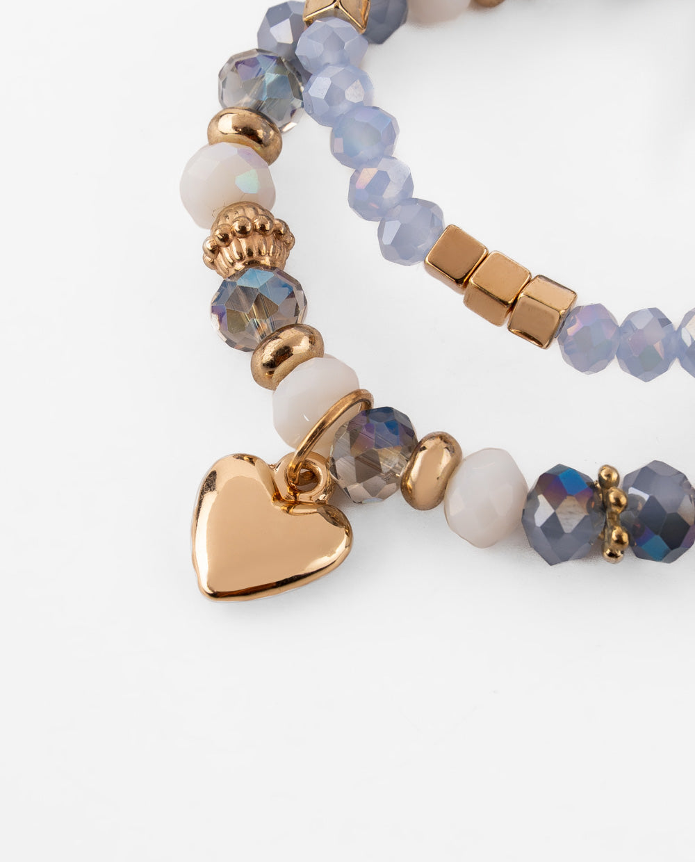 Set de pulseras elásticas con cuentas en tonos celeste y detalles dorados, acompañado de un dije en forma de corazón que aporta un aire romántico y femenino. Perfectas para usarlas juntas o por separado, sumando color y brillo a tu look cotidiano.