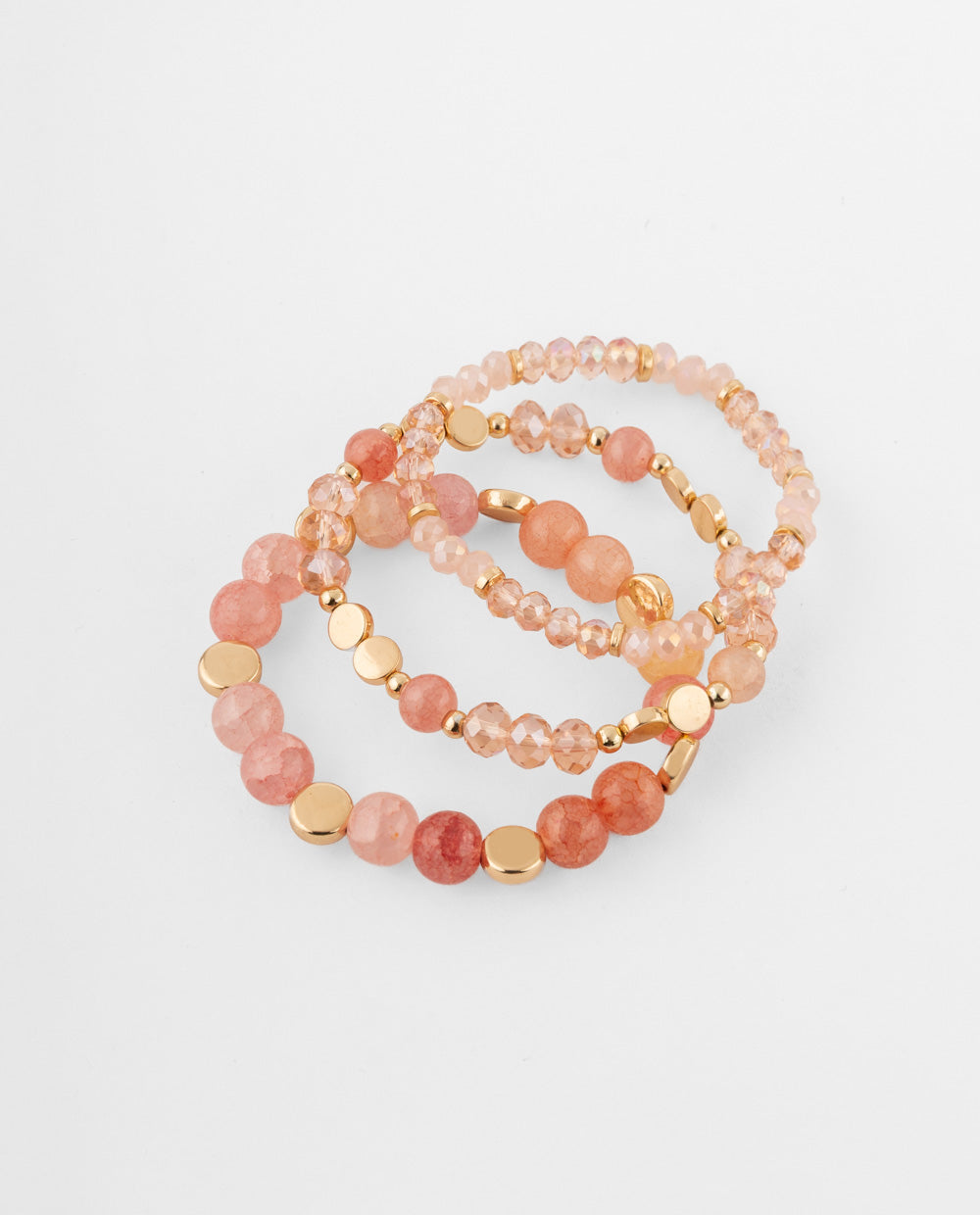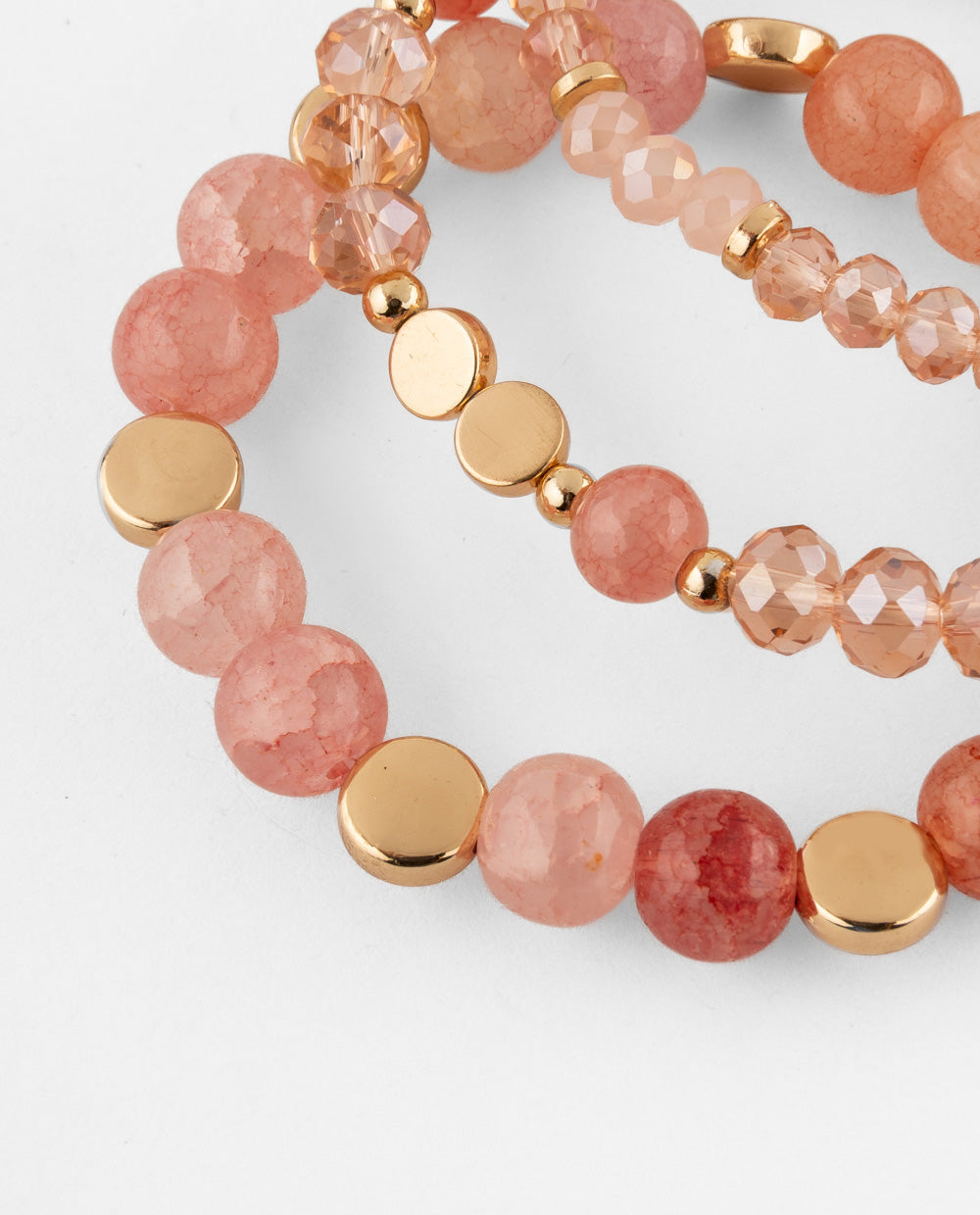 Set de pulseras elásticas con cuentas en tonos coral y detalles dorados, perfectas para dar un toque fresco y luminoso a cualquier look.