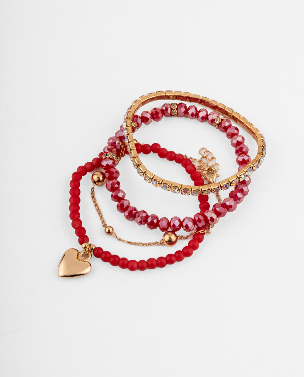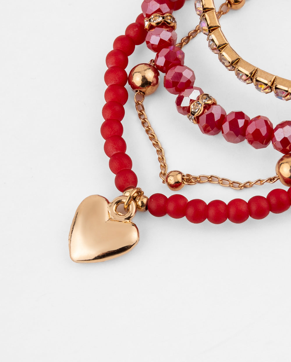 Set de pulseras en tonos rojo cábala con toques metalizados dorados y dije de corazón brillante. Su diseño combina cuentas facetadas, cadena dorada y cristales que aportan elegancia y energía positiva.