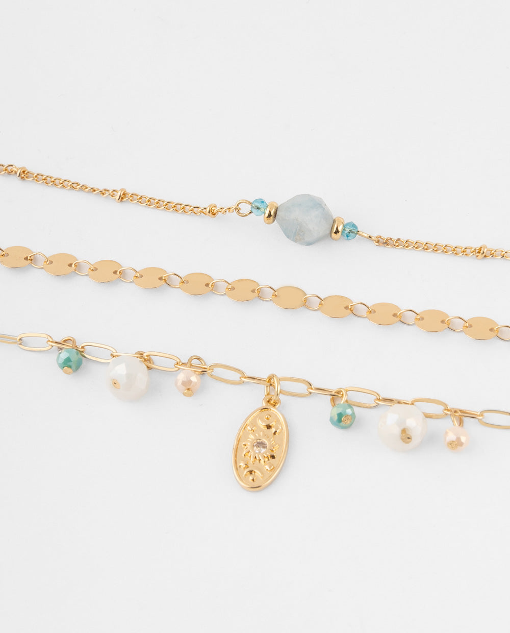 Set de pulseras doradas con perlas y cuentas en tonos celestes, detalle central facetado y dije ovalado decorativo.