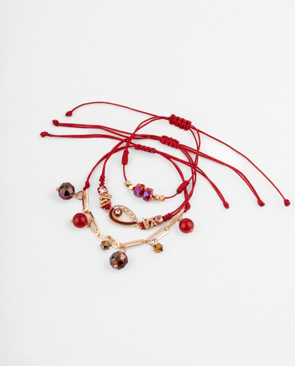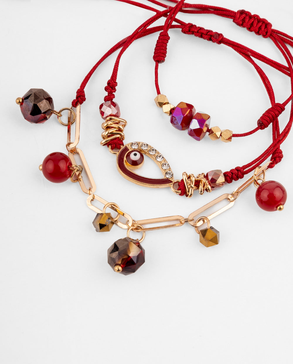 Set de pulseras en cordón rojo cábala con cuentas facetadas, detalles dorados y dije de ojo protector con incrustaciones brillantes. Un accesorio pensado para atraer buenas energías y dar un toque de poder a tu look.