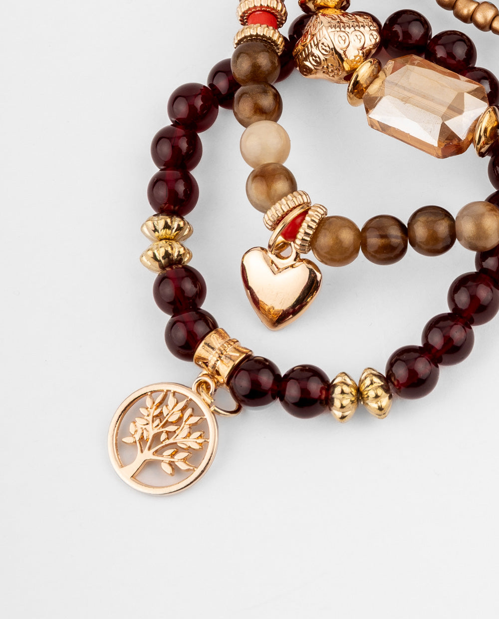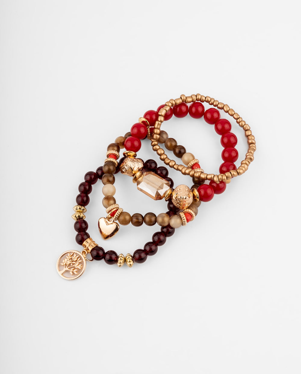 Set de pulseras elásticas en tonos rojo cábala, marrón y dorado metalizado, con dije de mano de la fortuna. Diseñadas para atraer buena energía y dar un toque poderoso a tu look. Perfectas para destacar en outfits de día o de noche.