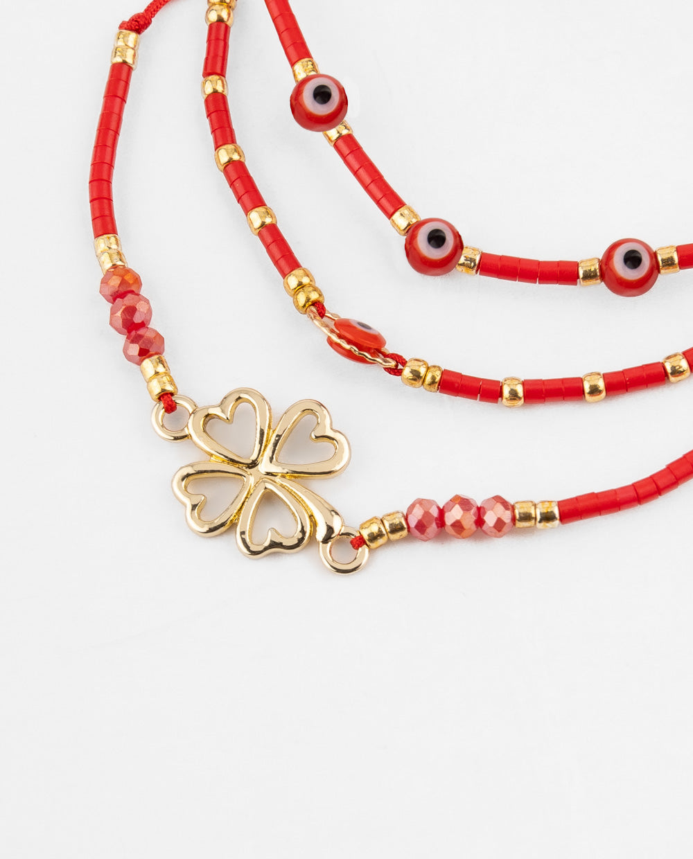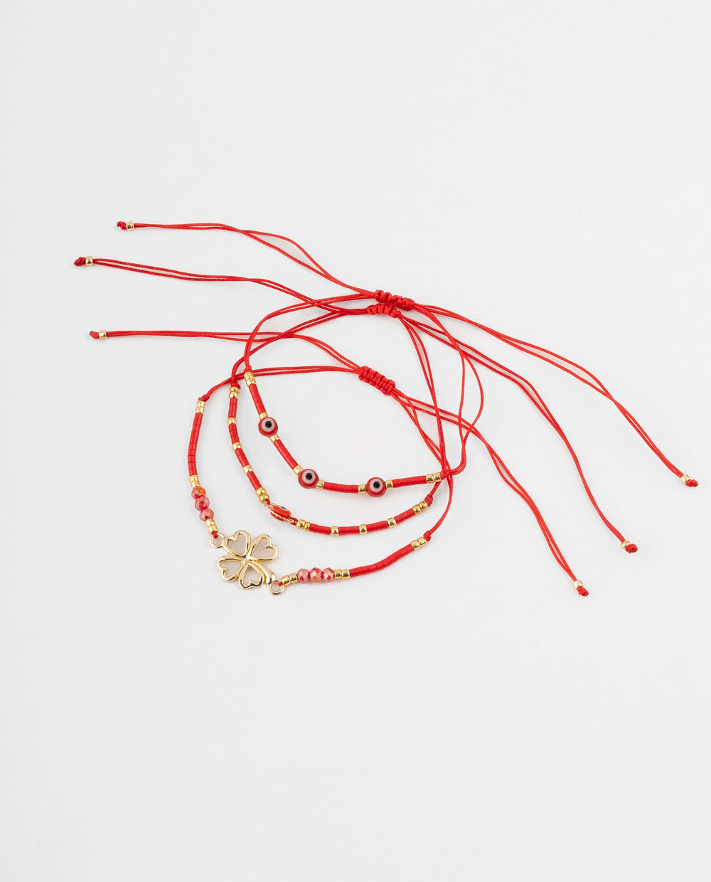 Set de pulseras ajustables en cordón rojo cábala con cuentas doradas y dije de trébol de la suerte. Diseñadas para atraer energía positiva y sumar un toque poderoso a tu look. Perfectas para usarlas juntas y destacar con fuerza o separadas para un detalle delicado en tu día a día.