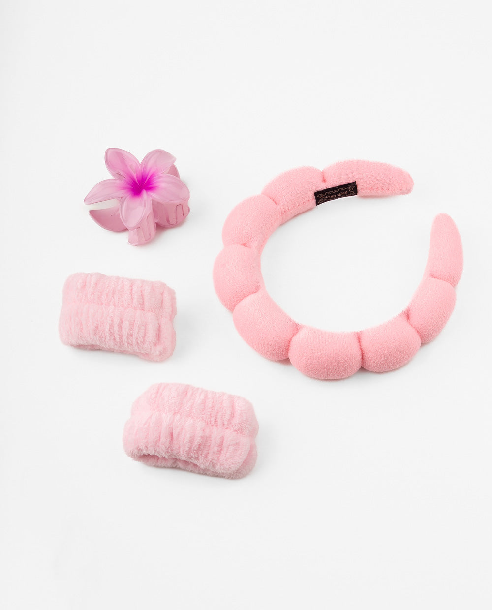 Nuestro set de spa en tono rosa incluye una vincha acolchada, dos muñequeras absorbentes y una flor decorativa, ideal para tus rutinas de skincare o momentos de autocuidado. La vincha mantiene tu cabello en su lugar, mientras que las muñequeras evitan que el agua se deslice por tus brazos. Todo en un diseño suave y delicado que combina practicidad con estilo.