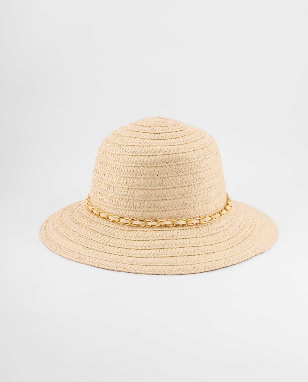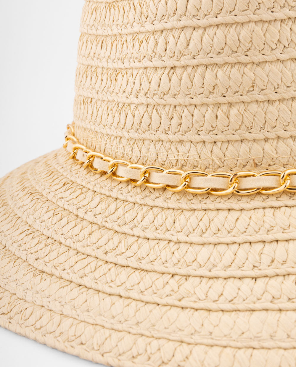 Sombrero beige de ala ancha con textura tejida y detalle de cadena dorada, perfecto para looks de verano con un toque elegante.