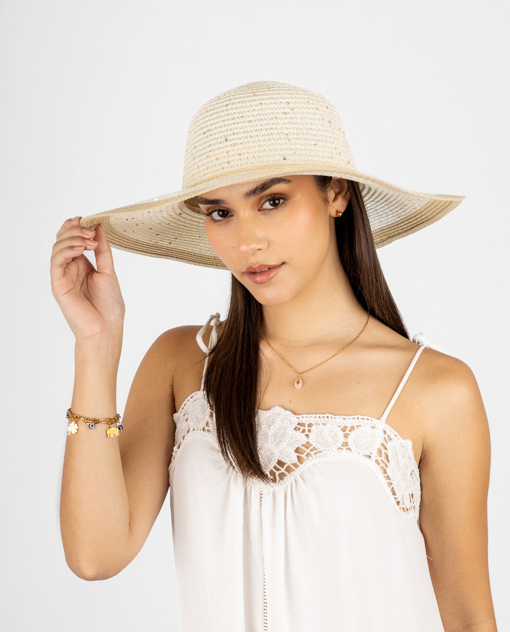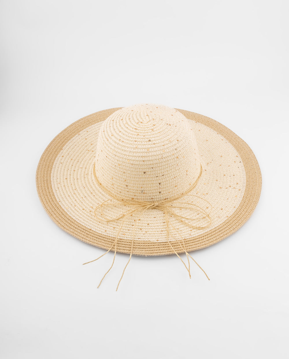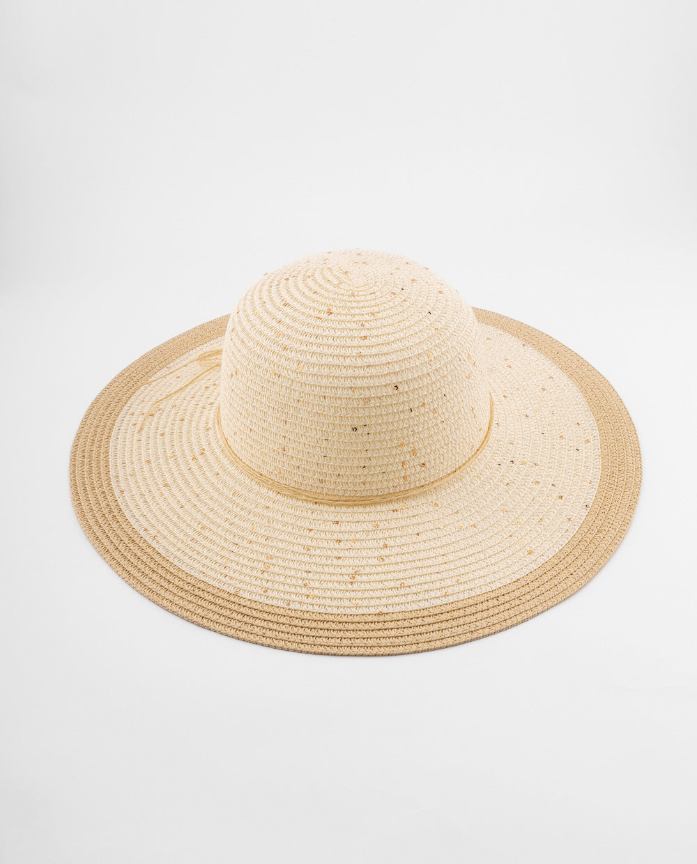 Sombrero beige tejido con ala ancha y borde café, ligero y perfecto para protegerte del sol con estilo veraniego.