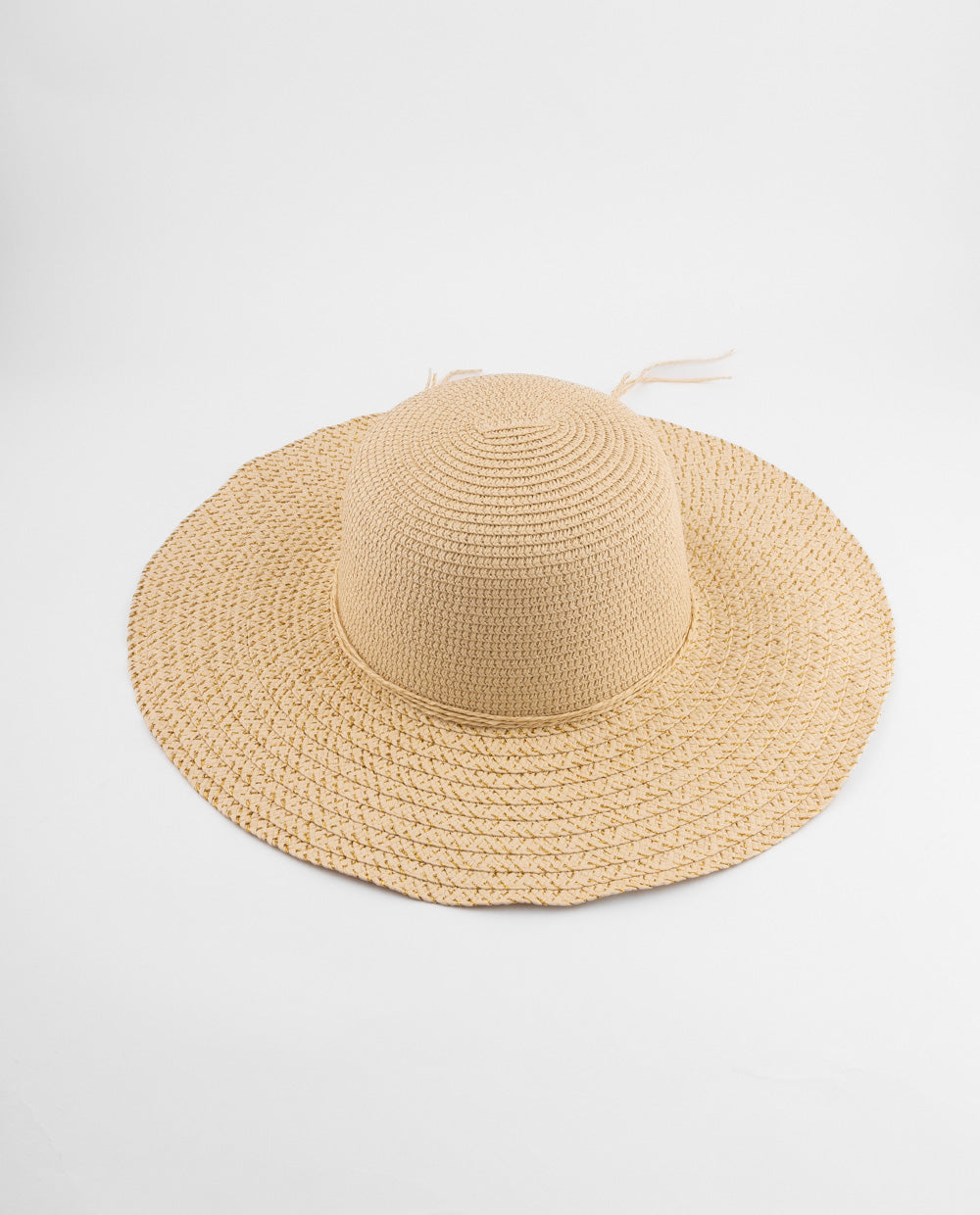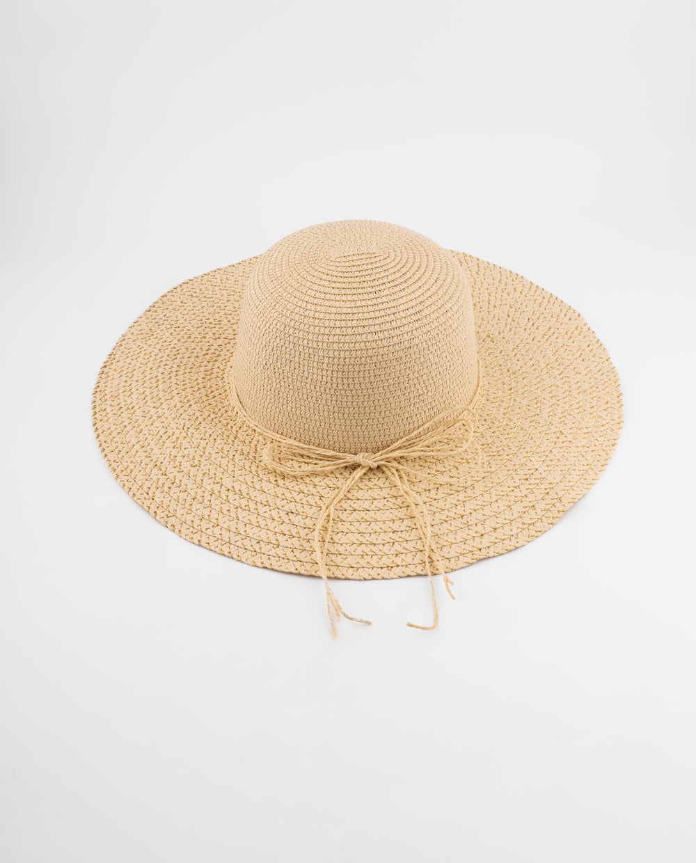 Sombrero beige tejido con ala ancha y lazo trasero, ligero y perfecto para protegerte del sol con un estilo natural.