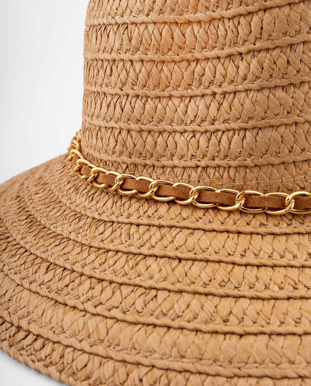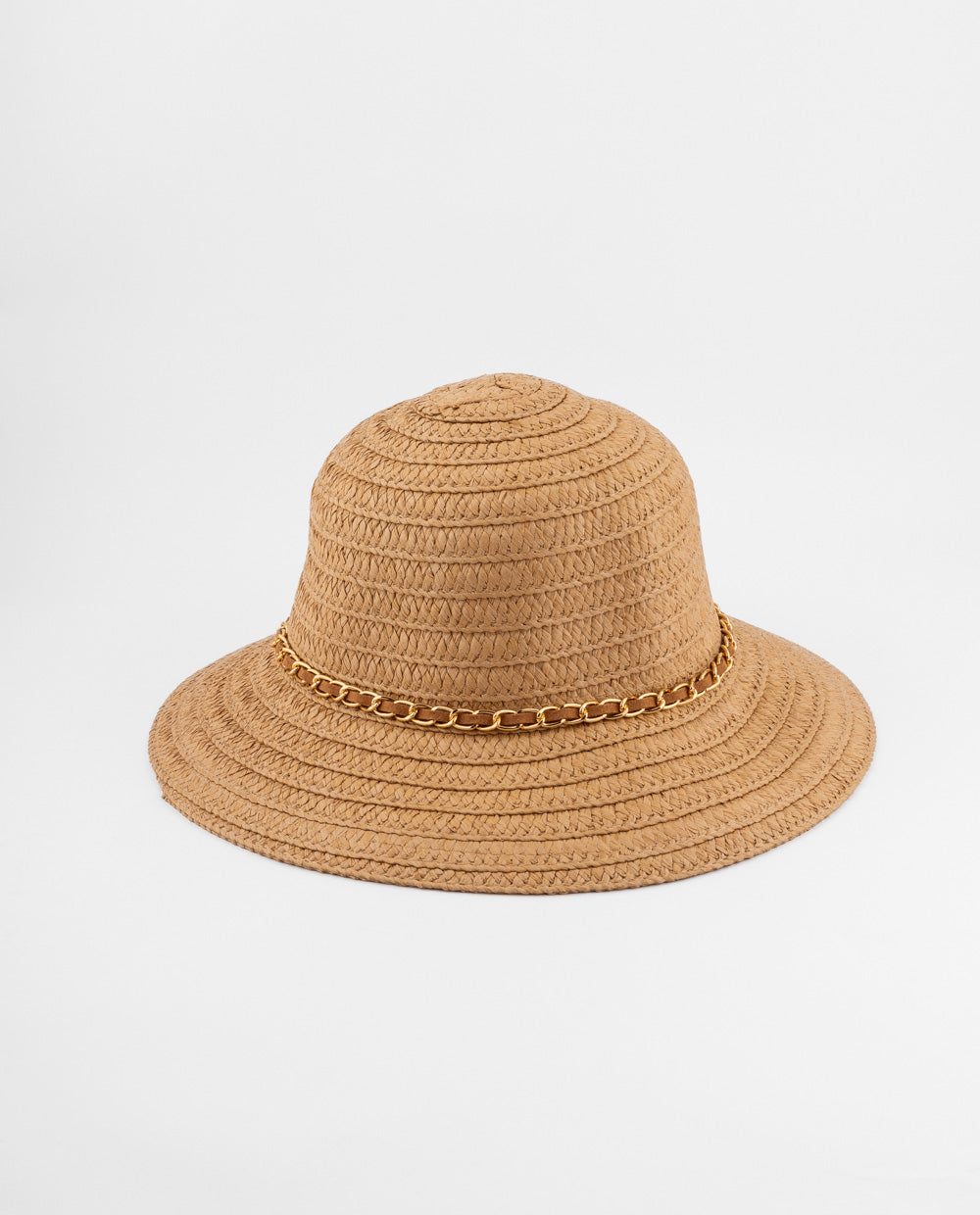 Sombrero camel de ala ancha con textura tejida y detalle de cadena dorada, perfecto para looks de verano con un toque elegante.