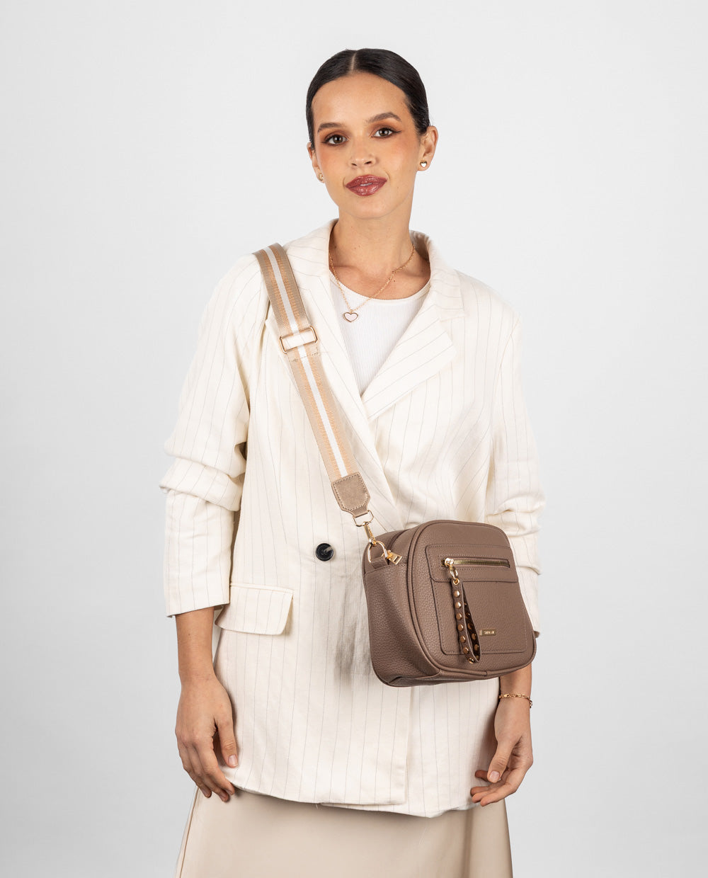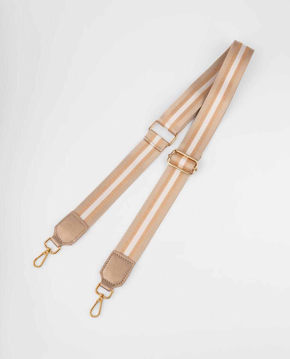 Dale ese upgrade a tu bolso con este strap beige de rayas. Su diseño en tonos neutros combina con todo, y sus herrajes dorados le suman un toque elegante. Hecho en material textil resistente con acabados en ecocuero, es ideal para llevar cruzado o al hombro. ¡Tu estilo, a otro nivel!