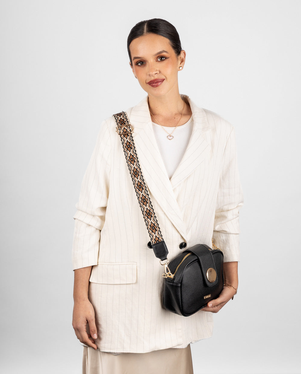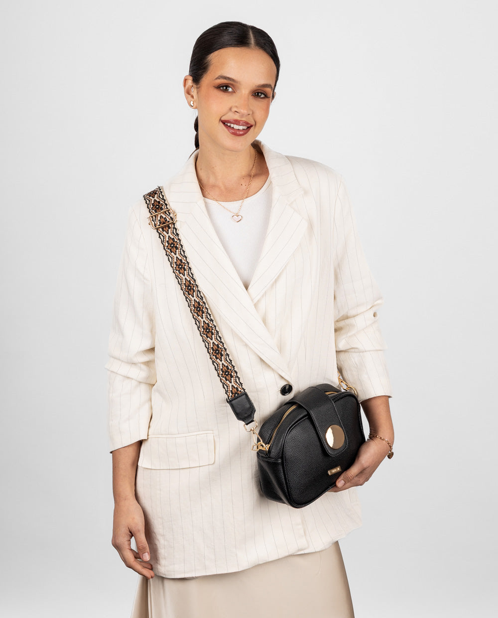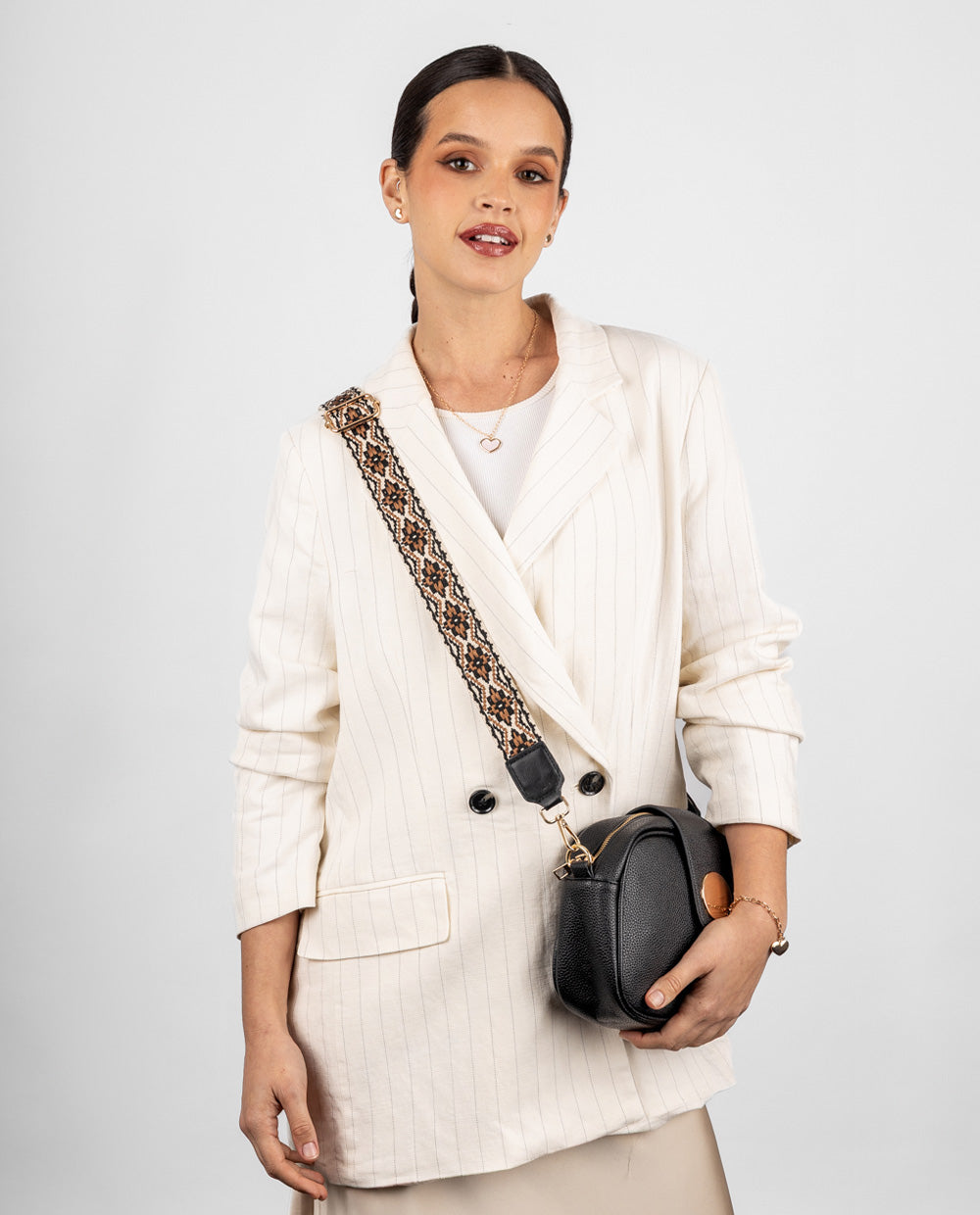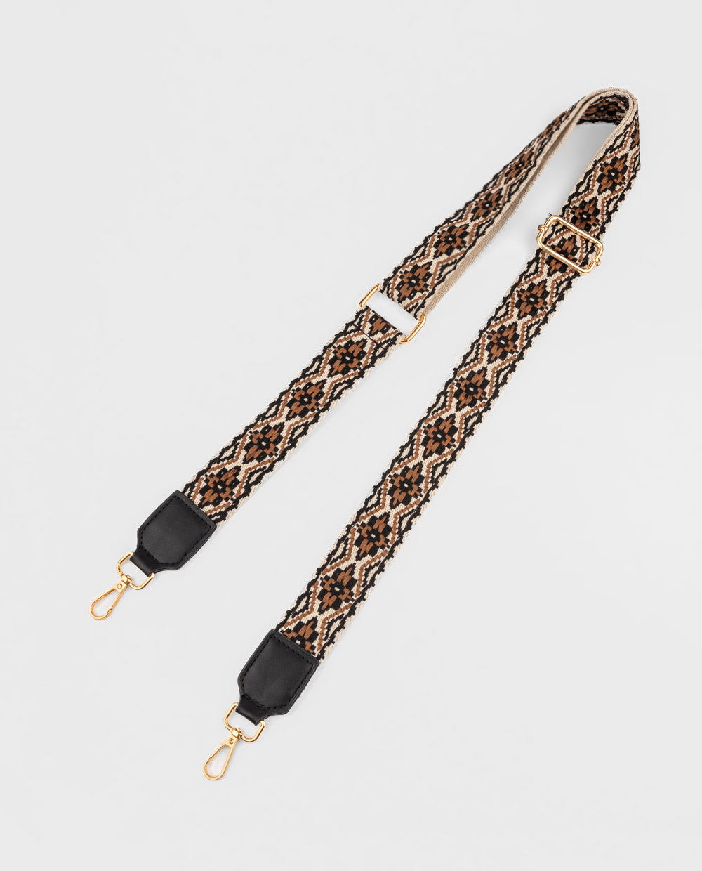 ¡Haz que tu cartera destaque con un toque diferente! Este strap de diseño tribal en tonos beige y negro es perfecto para renovar tu look sin cambiar de bolso. Con ganchos dorados y acabado ajustable, es el aliado ideal para combinar estilo y comodidad en tu día a día. ¡Exprésate con cada detalle!