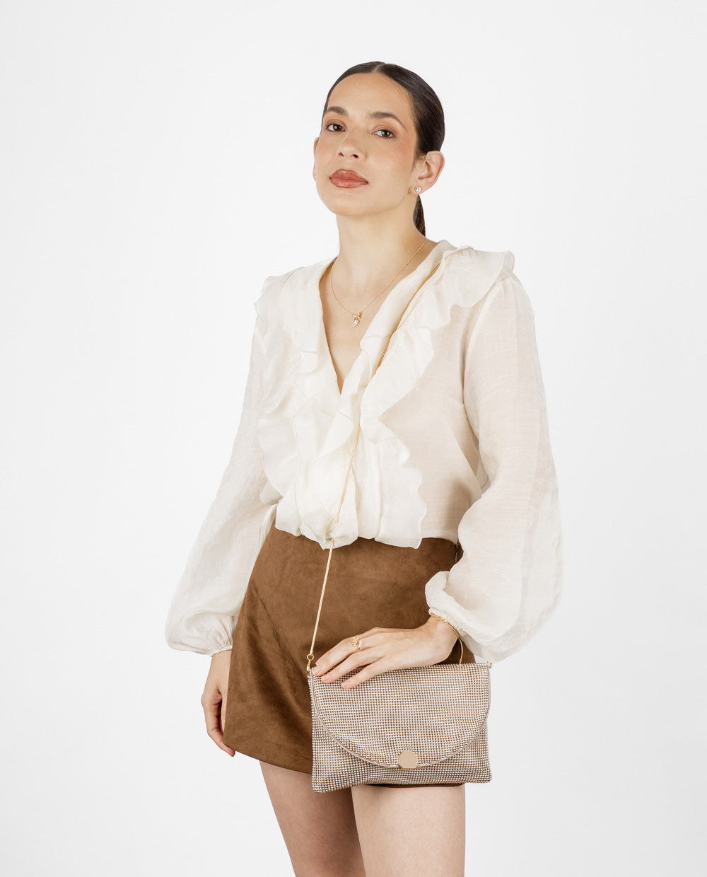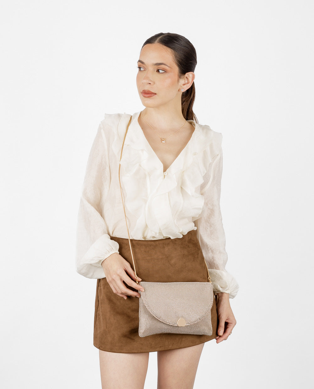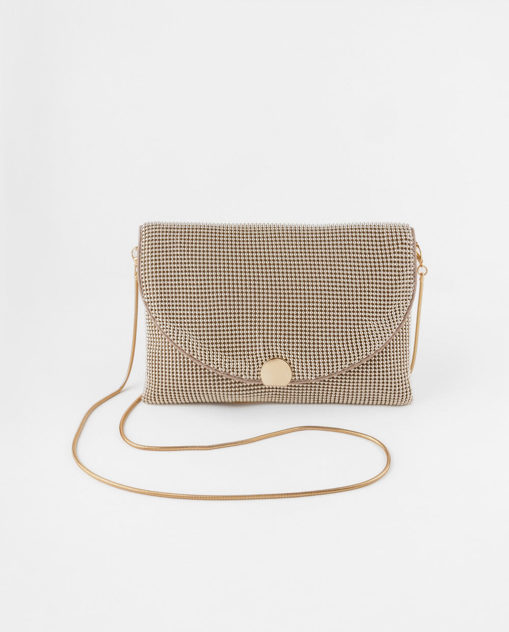 Luce el brillo perfecto para cada momento con esta cartera clutch dorada de la colección Glow. Su diseño elegante y texturizado añade un toque de sofisticación a cualquier look, mientras que su estructura liviana la convierte en tu aliada ideal para para brillar sin esfuerzo, de día o de noche. Incluye una correa larga tipo cadena delgada que permite llevarla colgada al hombro o como crossbody, según tu estilo. El broche metálico frontal aporta seguridad y detalle.