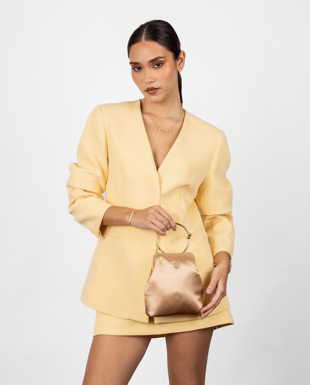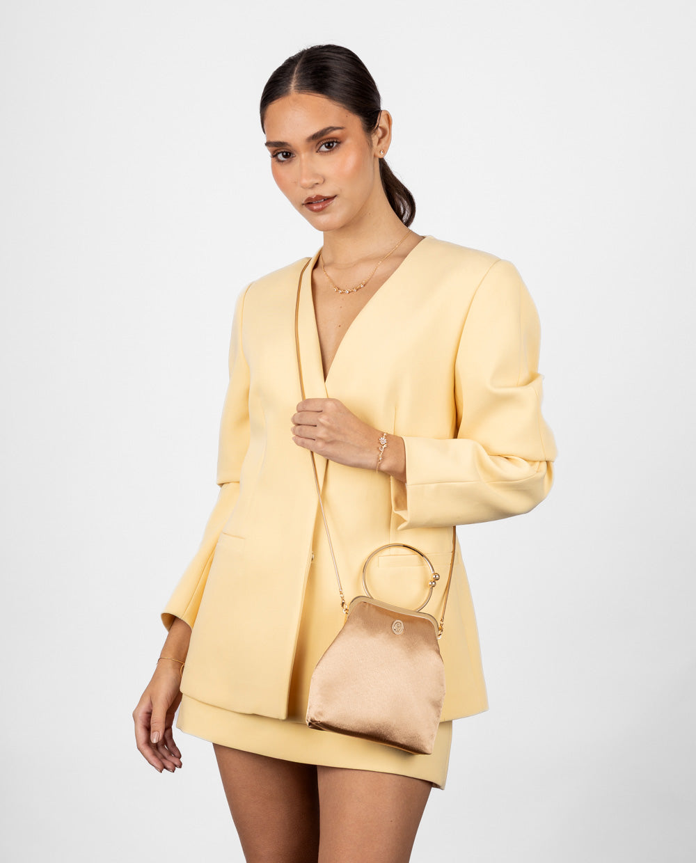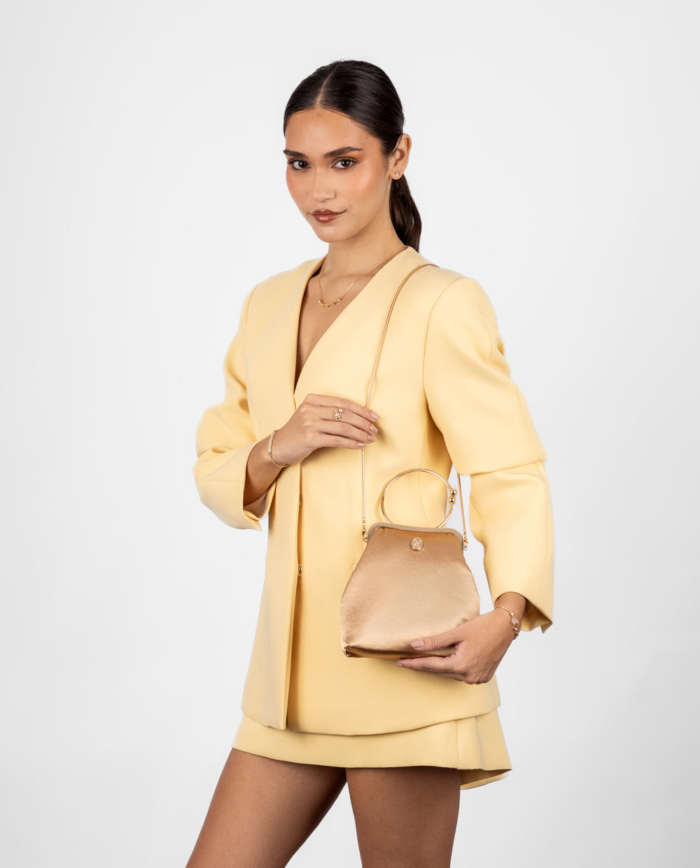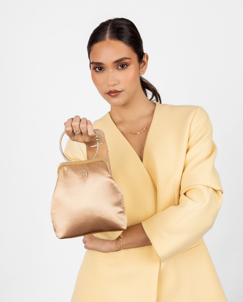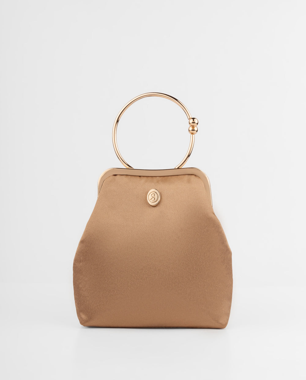Vanité en tono dorado de acabado satinado, diseñado para darle un aire sofisticado a tus looks de noche. Cuenta con un asa metálica circular y correa tipo cadena removible, que te permite llevarlo de mano o al hombro con total estilo. Un accesorio versátil que destaca por su brillo y elegancia.