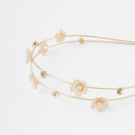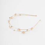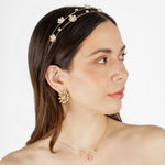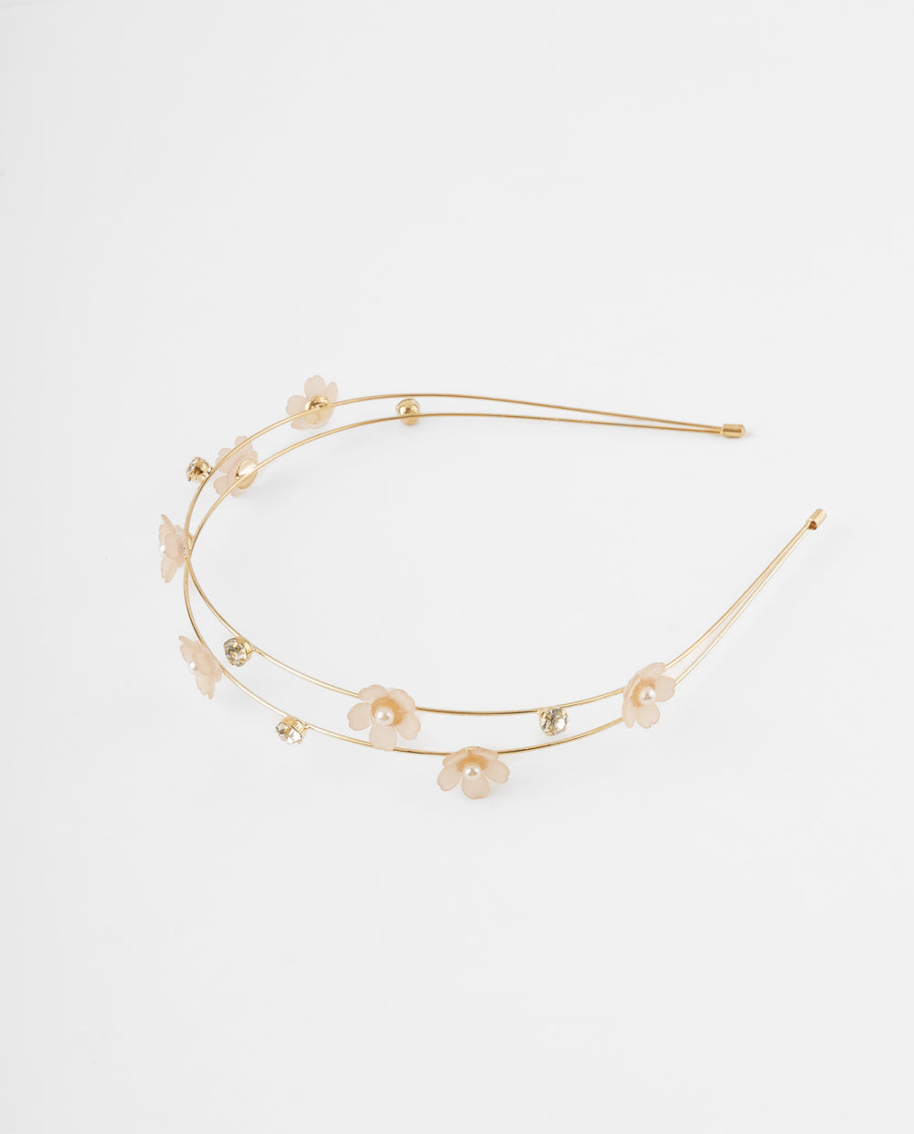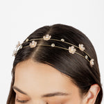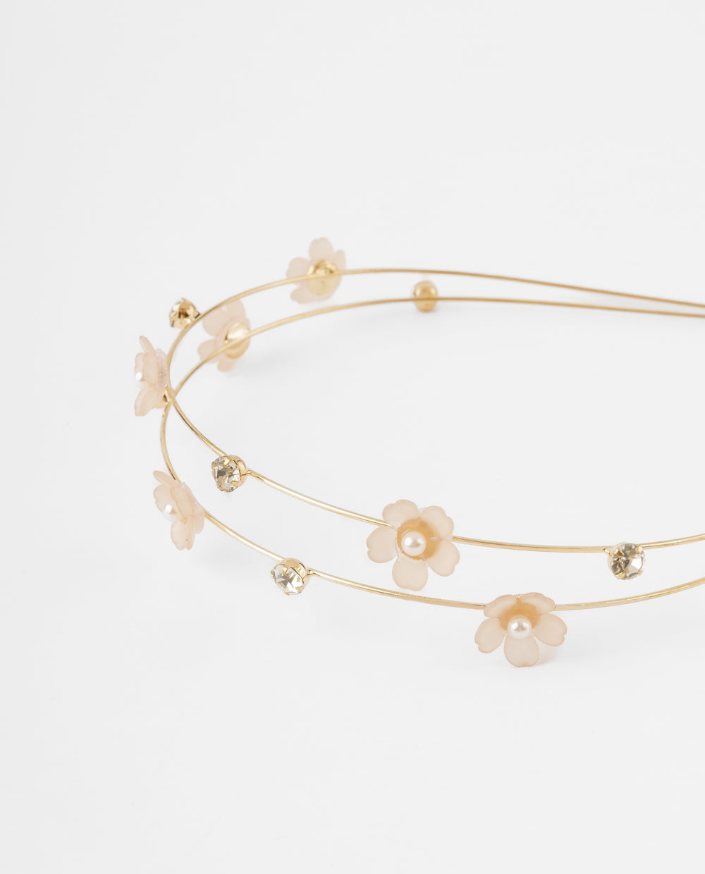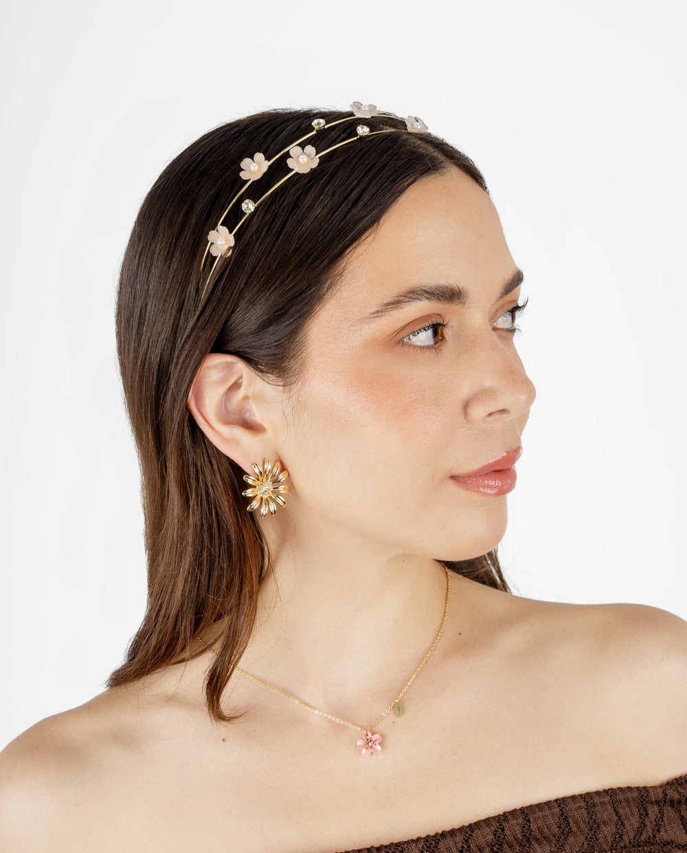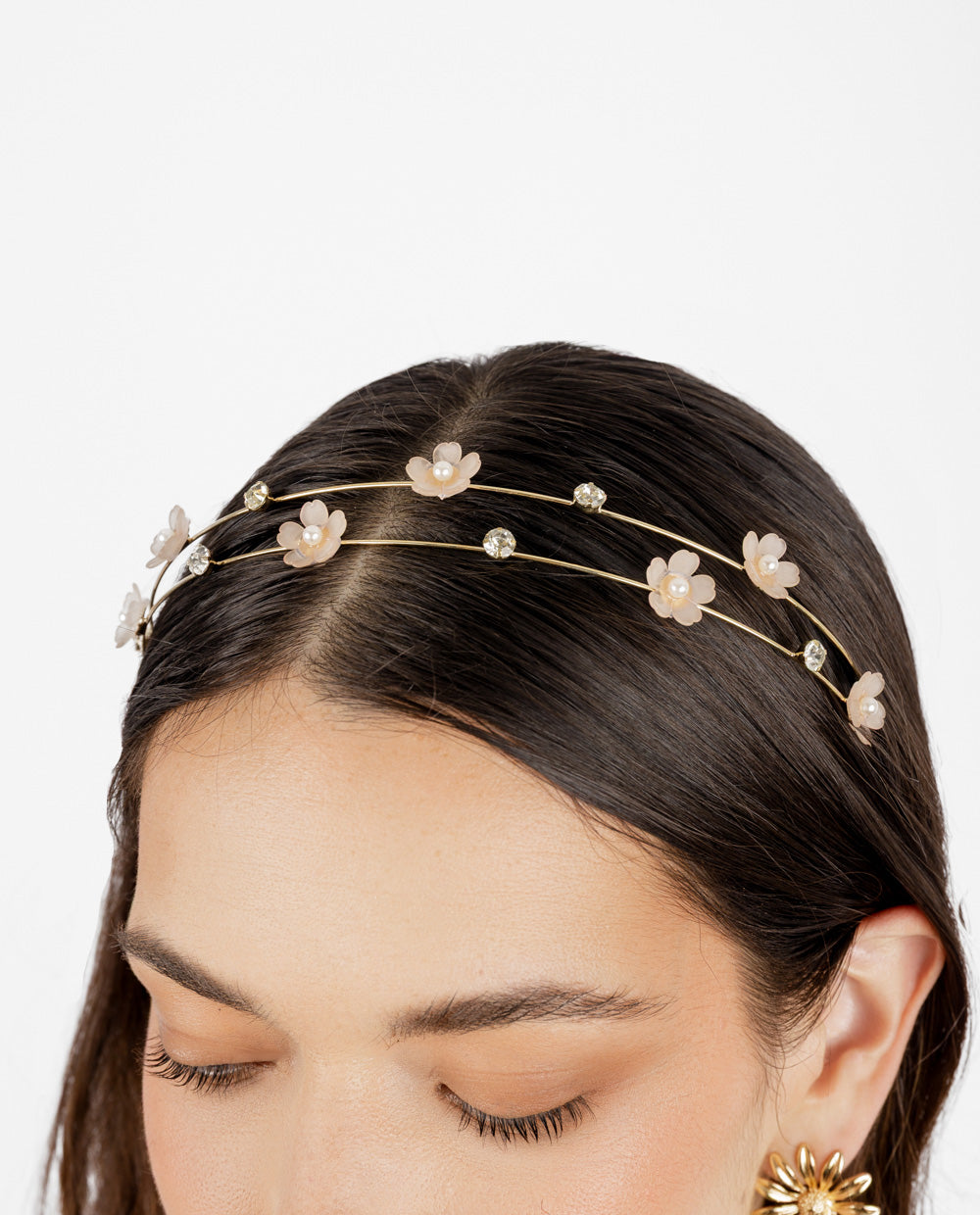 Vincha doble de metal dorado adornada con delicadas flores con centro perlado y pequeños cristales que aportan un brillo sutil. Su diseño fino y elegante la convierte en el accesorio perfecto para complementar peinados románticos y ocasiones especiales, añadiendo un toque femenino y sofisticado.