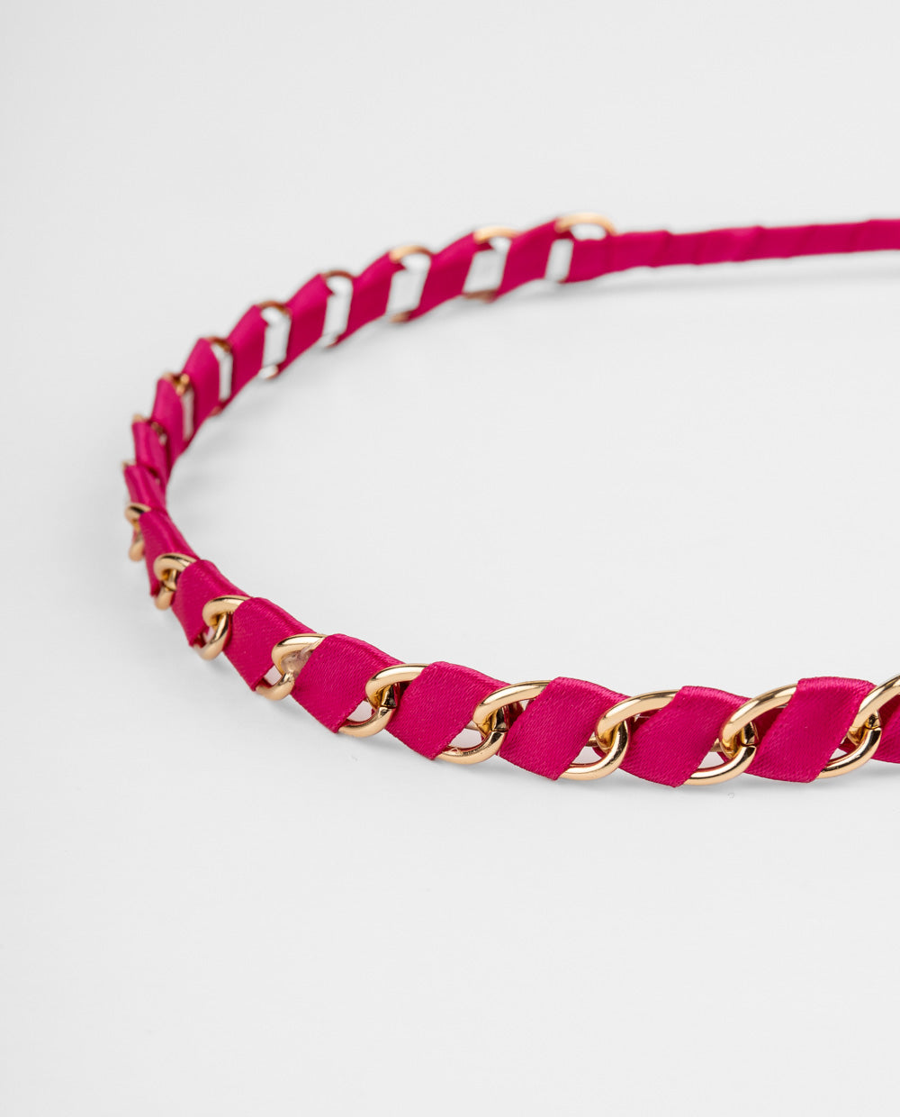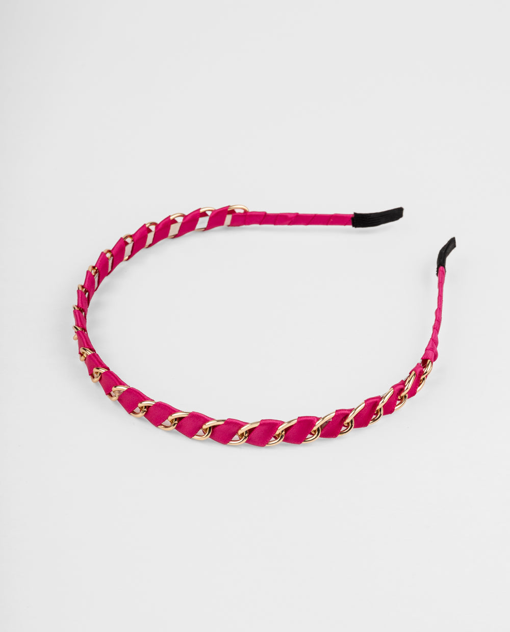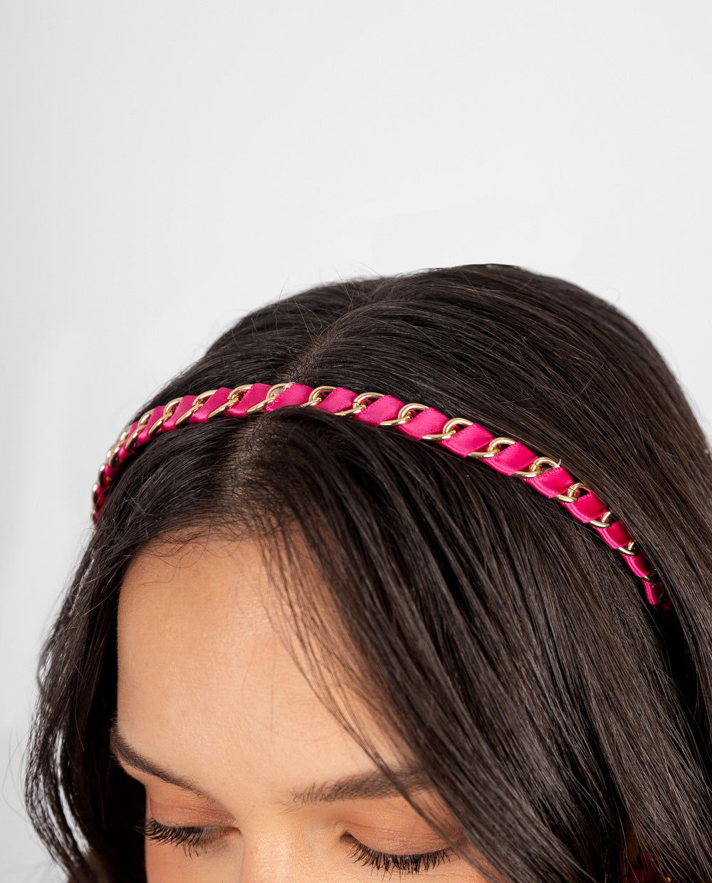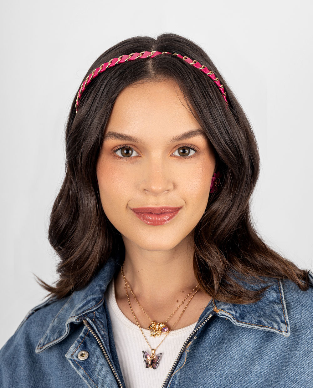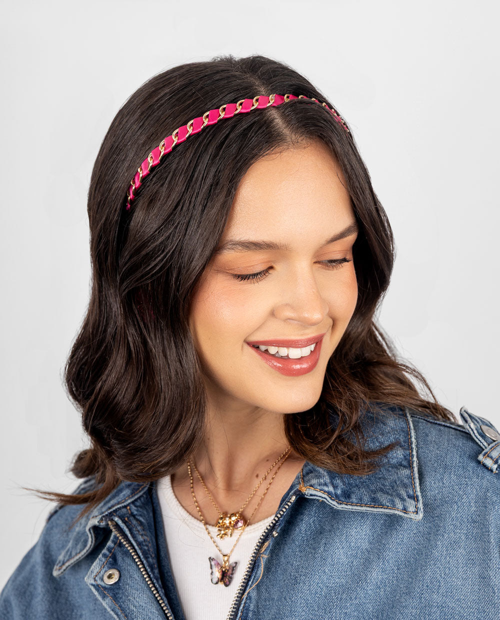 Dale un toque chic a tu look con esta vincha forrada en cinta fucsia, decorada con una elegante cadena dorada entrelazada. Su diseño cómodo y ligero es ideal para complementar outfits casuales o elevar tus peinados del día a día. Perfecta para sumar color y estilo en segundos.