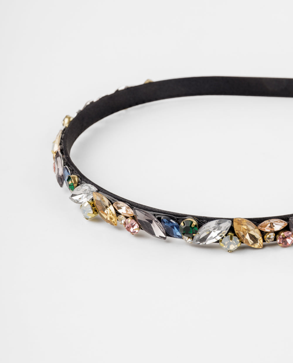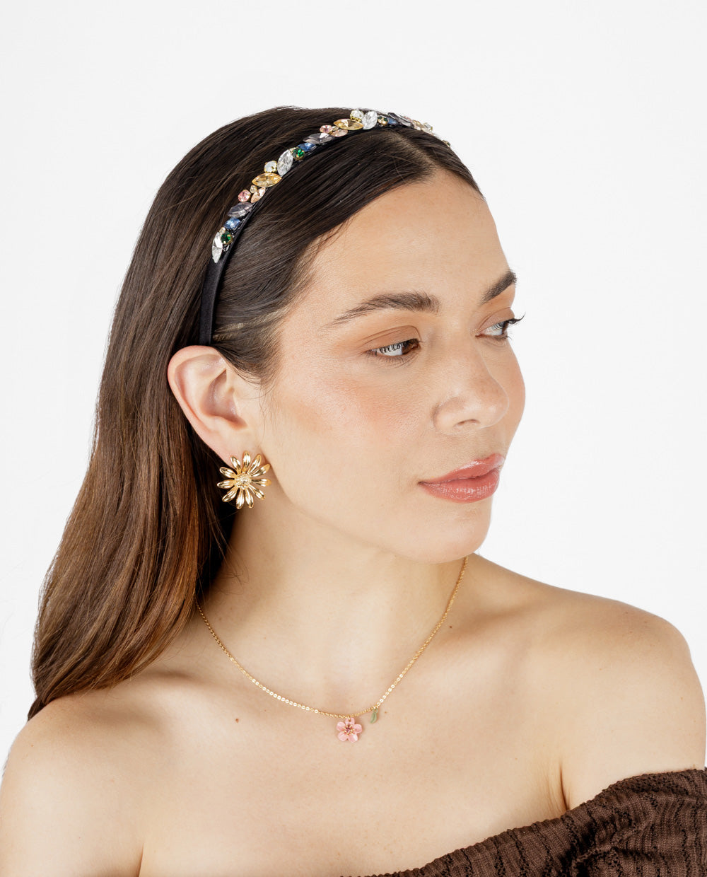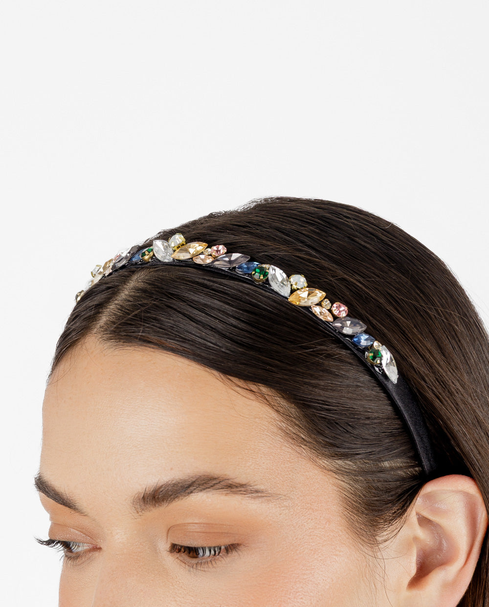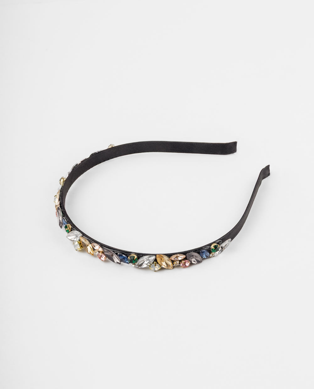 Eleva tu look con el toque brillante y colorido de esta vincha negra adornada con pedrería multicolor. Perfecta para darle un giro chic a cualquier peinado, ya sea casual o elegante.
