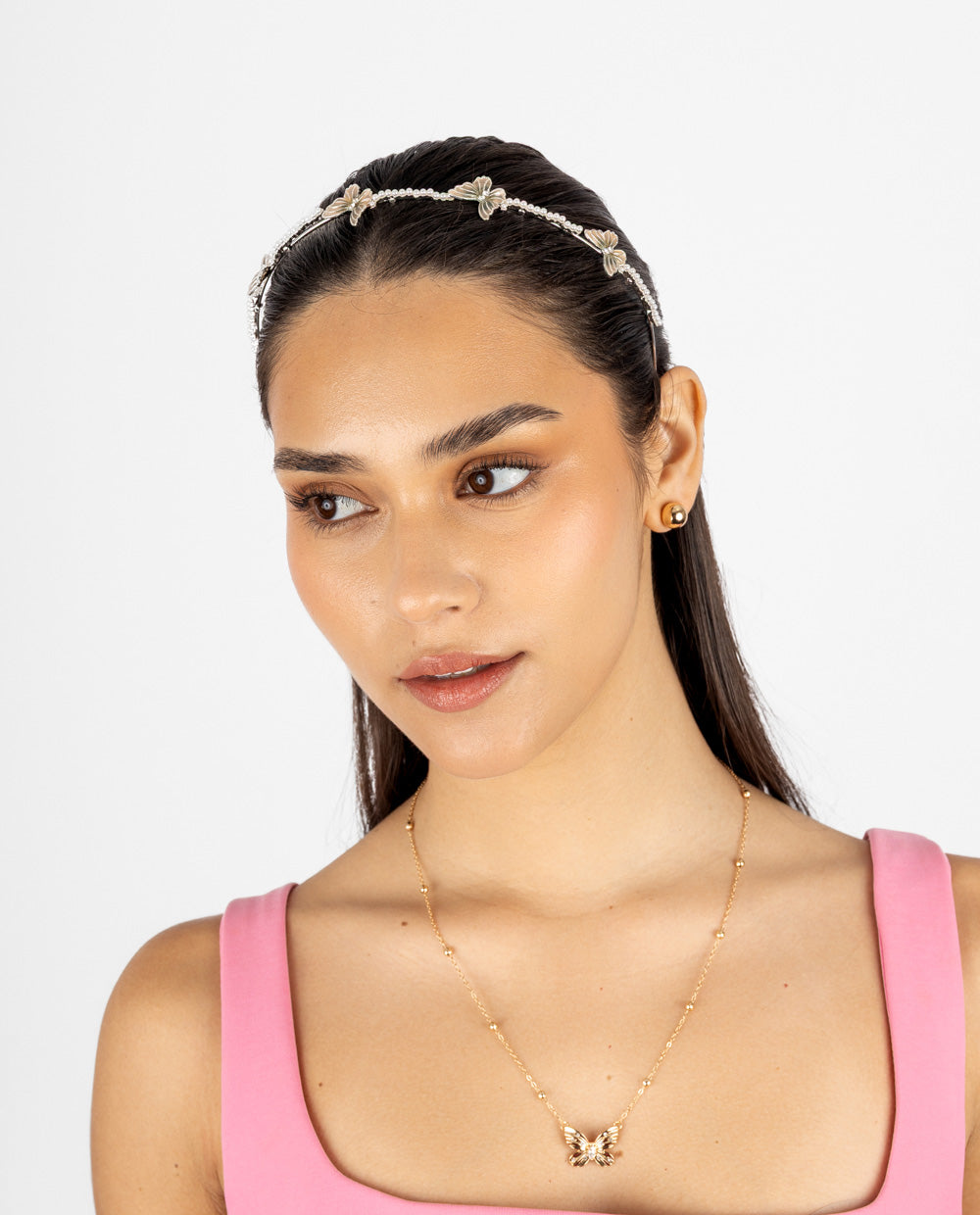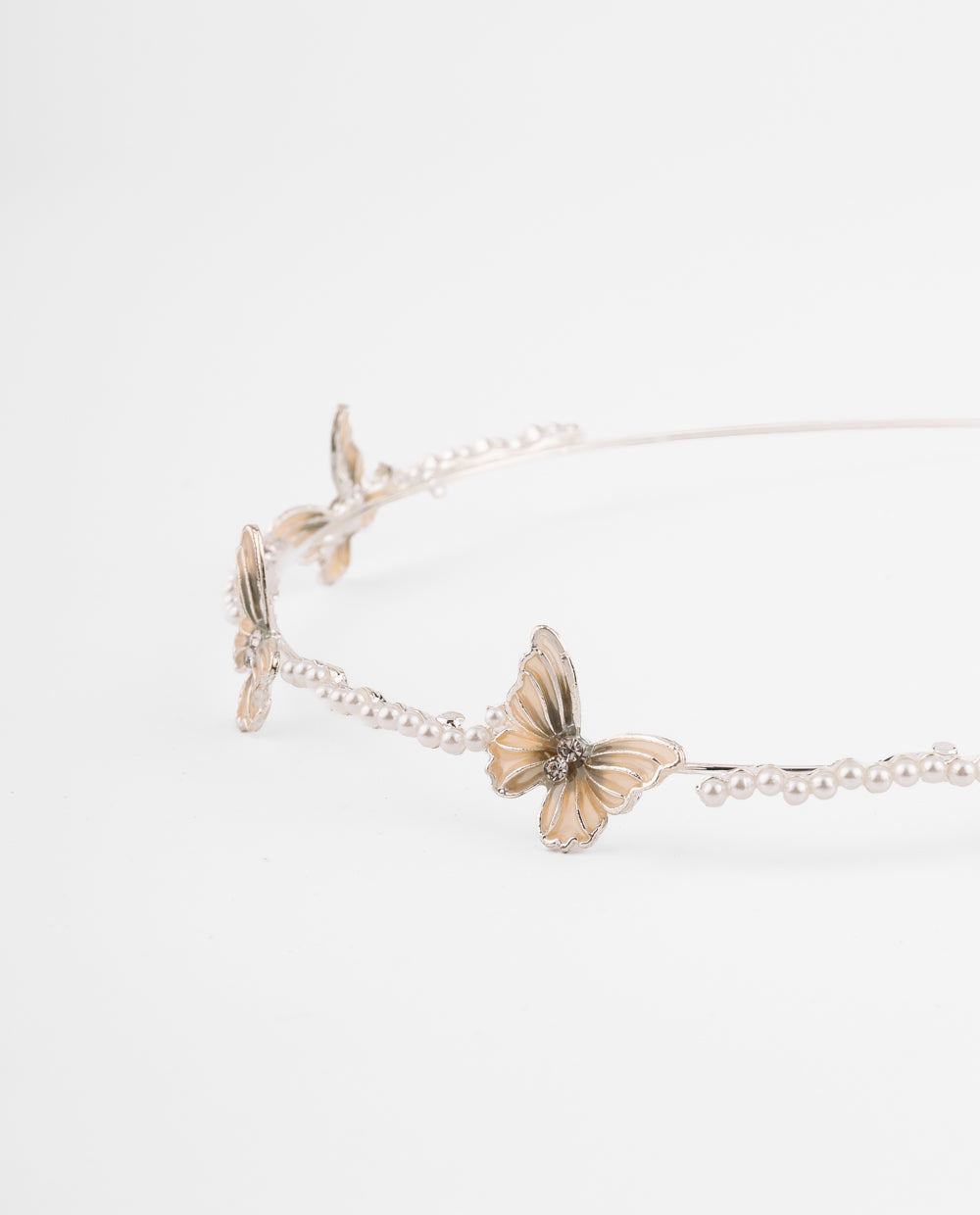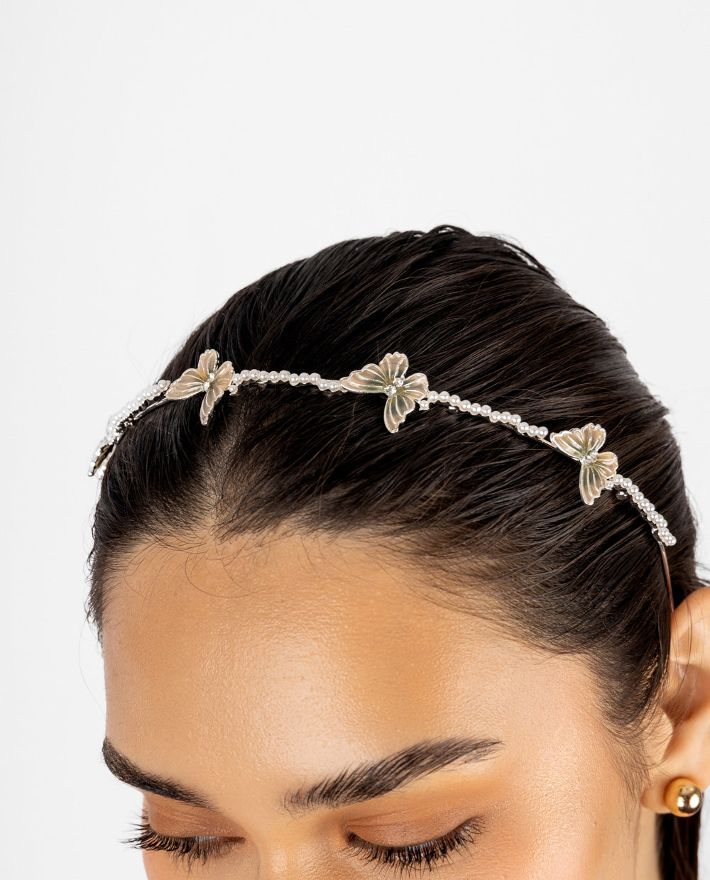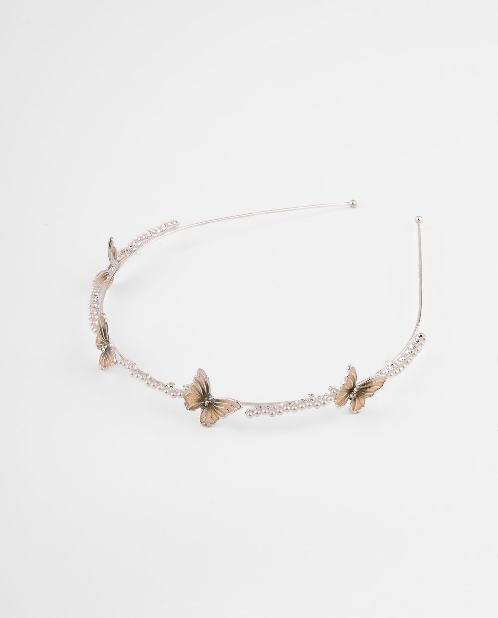 Vincha metálica delgada decorada con mariposas en tono plateado y pequeñas perlas.