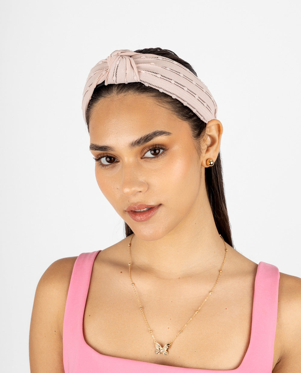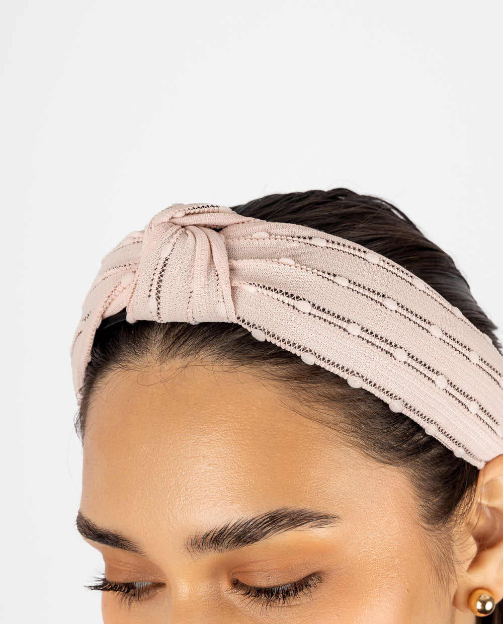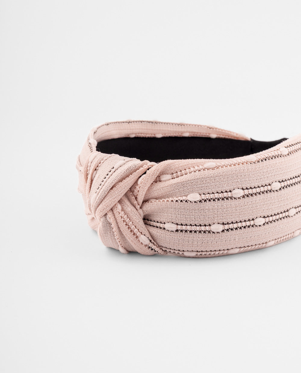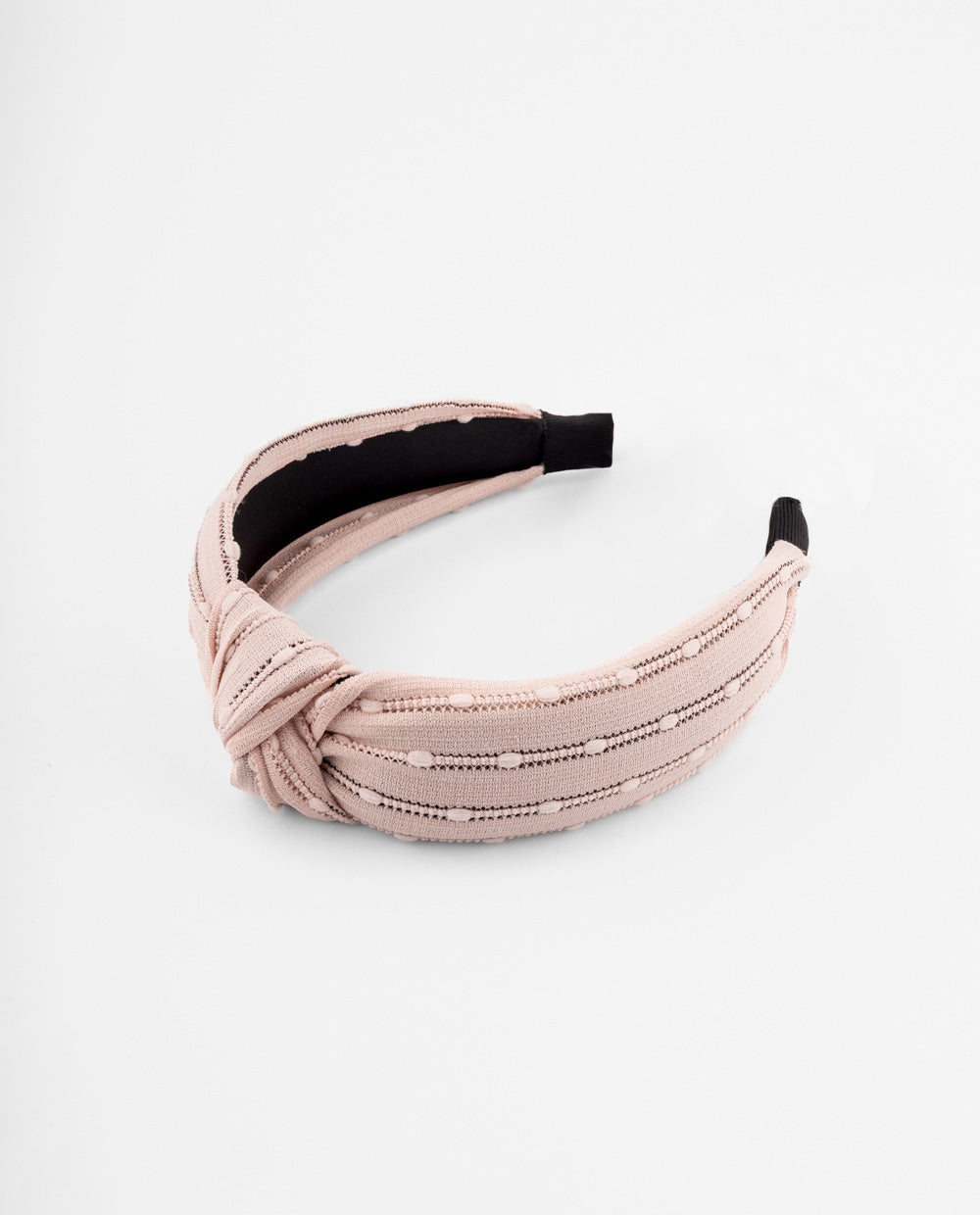 Vincha en tela rosa con textura de pequeños puntos en relieve y diseño con nudo frontal que aporta volumen. Cuenta con base rígida forrada y puntas acolchadas.